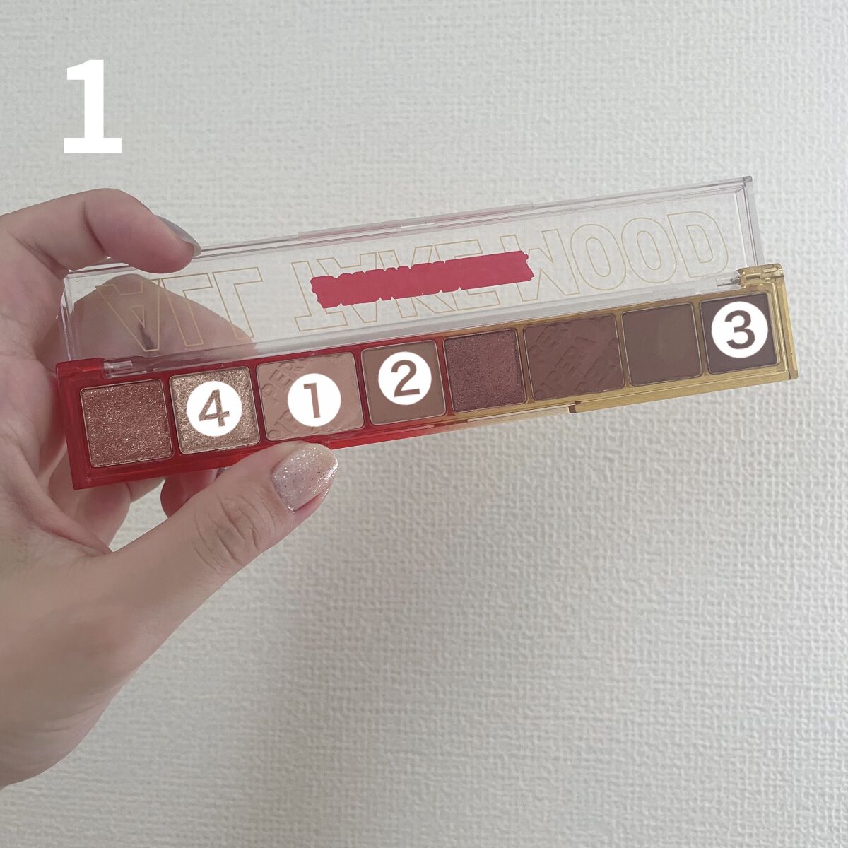 これを買ったきっかけがあまりにも安かったからだけど質も色もめっちゃ良かった🧡 自称イエベ秋の私にピッタリでした! 10回擦ってみたら、ラメは落ちてしまったけどマットカラーはしっかり色が残ってて優秀だった! ここでは2パターンのメイク紹介します! 1では、①をアイホール全体に塗って、②を二重幅に塗ります。③で目尻を囲んで④を涙袋とまぶた黒目の上に塗って完成です! 2では、①をアイホール全体に塗って、②を二重幅と目尻に塗ります。③を涙袋と瞼黒目の中央に塗って完成です!