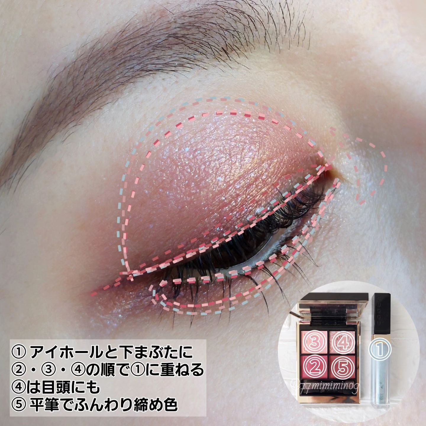 mude.のパレットの左上偏光カラーがピンクラメでかわいいなーって眺めてて。 いつもは赤がもう少し深みっぽくなるけど、こっちは明るく澄んだ感じ✨ しかもコートカラーのラメとmude.の偏光カラーがめちゃくちゃツヤ感と透明感を出してくれる🫧