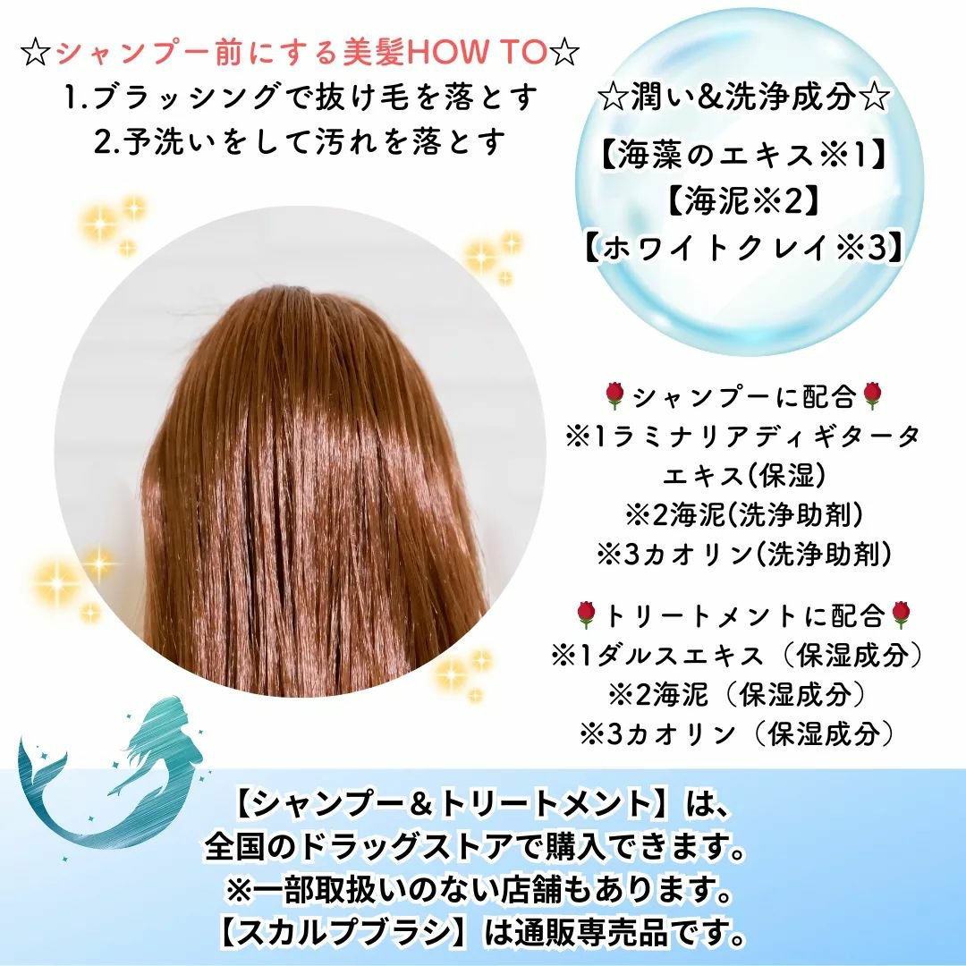 美髪は頭皮を健康的にすることがカギ!健やかな頭皮と髪へ導く。やさしく洗い上げ、毛先まで潤ってまとまる! 海底から採取した海泥と、鉱山由来のホワイトクレイを配合。頭皮のうるおいを保ちながら、毛穴の汚れを吸着除去。 ローズヒップの甘酸っぱい香り付きで、お風呂場に甘く爽やかな香りが広がり、ヘッドスパのようでした♪