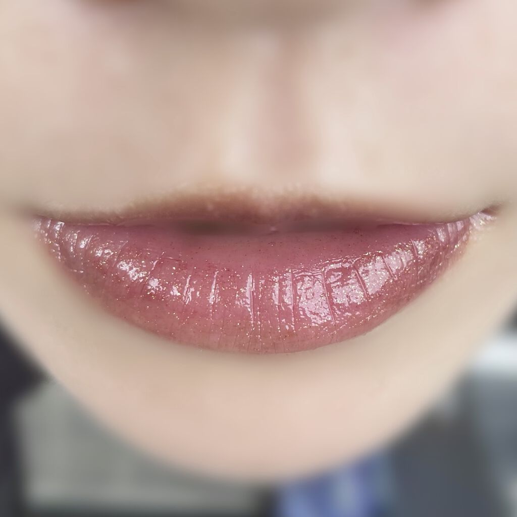 実際塗ってみるとモーヴとローズカラーが混じった綺麗目発色に✨ゴールドラメ入り☺️ オイルベースの保湿効果で、付けたあとはツヤツヤに👏 見た目のリップカラーと付けた後のカラーが違うのが不思議で魅力的🍀 5Rコンパウンドベース効果あり、肌に馴染みやすくなってるよ 透明感があるので美しく仕上がるよ💄💕