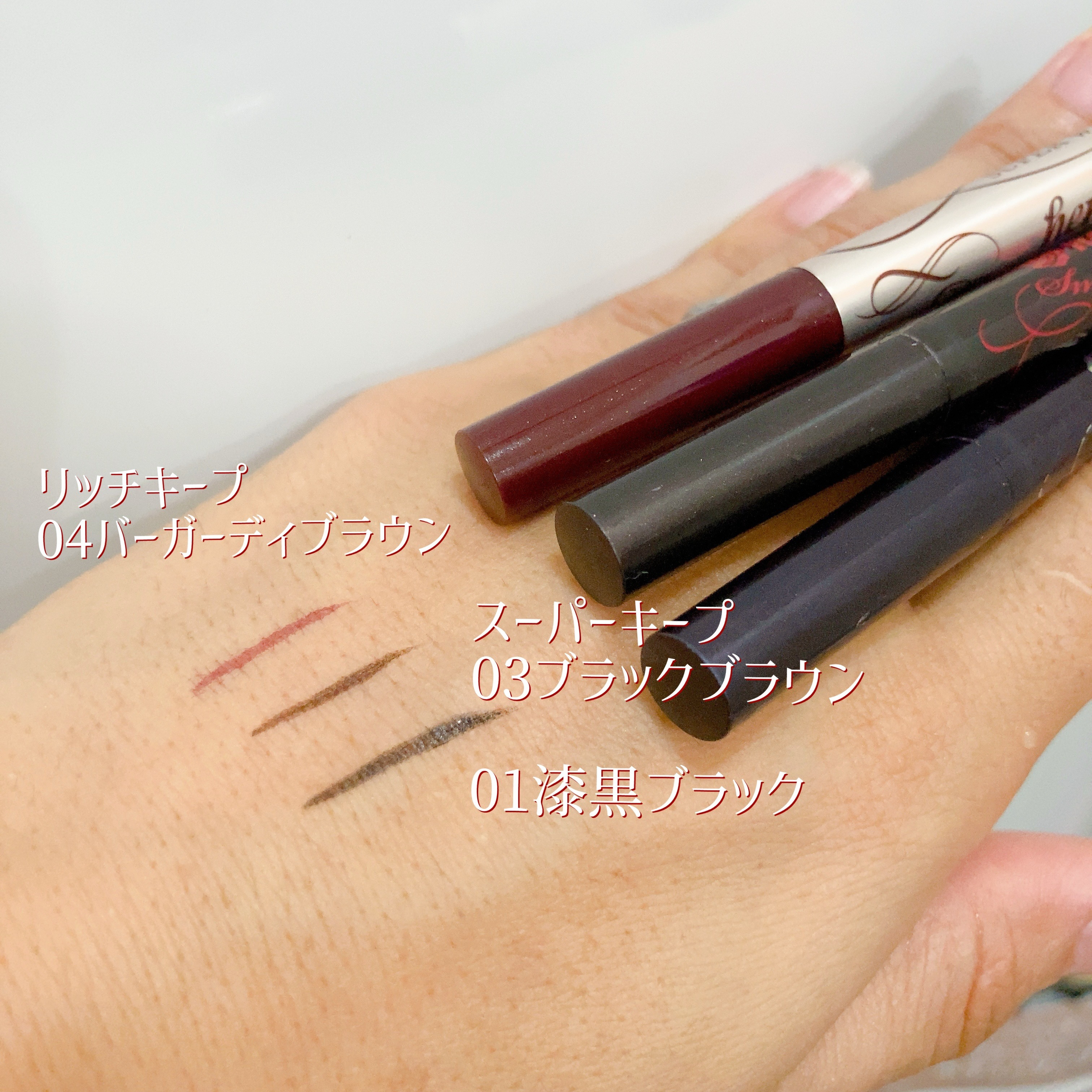 とっても描きやすくてびっくりしました!! コシのある極細筆なのでヨレずに描けるししっかり発色してくれたのが嬉しかったです。 細いラインも太めのラインもコントロールしやすいなと感じました❤ とにかくスラスラ描ける!! 落ちにくい ブラウンっぽさが強いから普段使いしやすい 赤っぽさの強いバーガンディブラウンを探している方には物足りないかも?? 手の甲に使ってみるとバーガンディな色味を感じることができたものの、目尻に入れるとブラウンが強いかなという印象。 程よいニュアンス感が楽しめるので私はお気に入りになりました♪