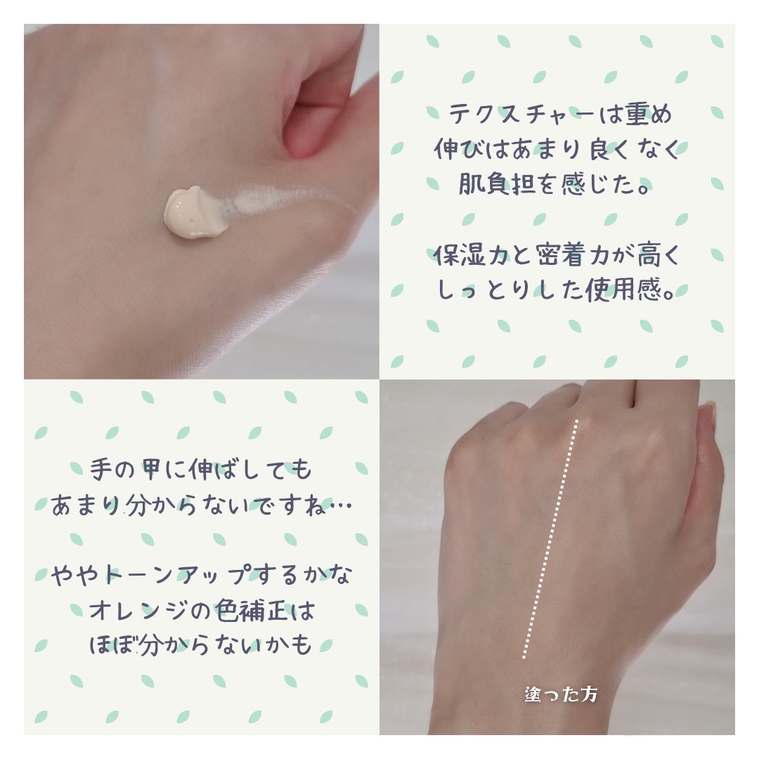 肌色っぽいオレンジ色の下地です😊塗り心地も軽くスルスル塗れます💕くすみが気になるのでオレンジで肌馴染みが良く自然にトーンアップしてくれます✨カバー力はそこまでないですが乾燥もせずよれにくいと感じました☺️プチプラで使い心地は良かったのですがS...