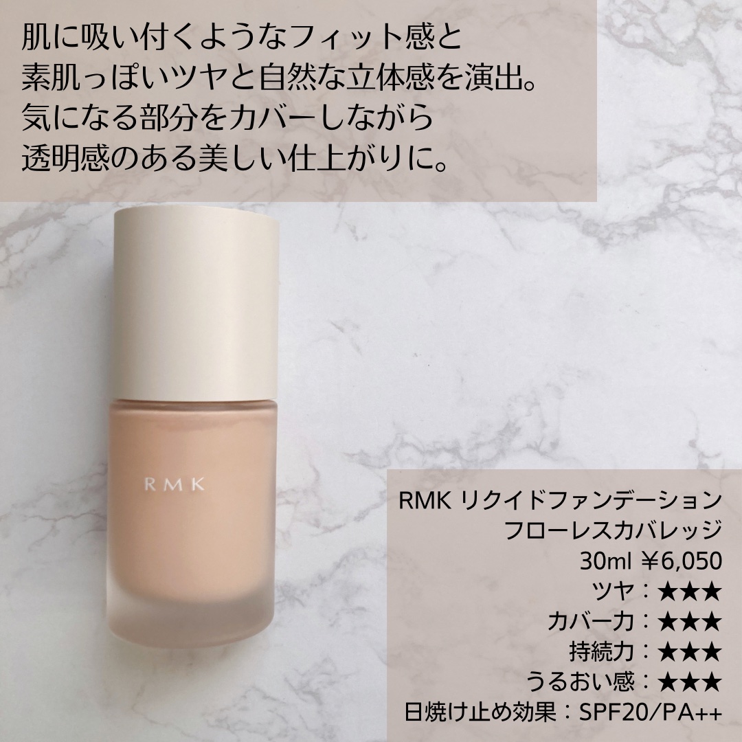 大人気!RMKファンデ4種類を徹底比較✨たくさんの方に見ていただいているRMKのファンデーション3タイプ比較投稿ですが、少し前に追加したパウダータイプもプラスして、アップデートしていきます!ちなみにどのタイプも明るめのピンク系201番を使用♡【クリーミィファンデーションEX】一番最初に買ったRMKのファンデーション。しっとりとした使用感で保湿力高めなので秋冬メインで使っています。明るく透明感のある肌に仕上がります。【リクイドファンデーション】春になってクリーミィファンデーションEXが少し重く感じたので春夏用に購入したファンデーション。(軽い使用感が好きで秋冬も使っています。)水のようにサラッとしたテクスチャーで軽やかに肌に伸び広がり、みずみずしい使用感です。ナチュラルで健康的なツヤ肌に仕上がります。【リクイドファンデーションフローレスカバレッジ】昨年発売したファンデーション。カバー力と透明感を兼ね備えていて、気になる部分はしっかりカバーするのに素肌感のあるツヤ肌に仕上がります。「RMKのファンデはカバー力が…。」と思っている方にぜひ使っていただきたい!🆕【エアリーパウダーファンデーションN】RMKのファンデーションでは唯一のパウダリーファンデーション。軽やかな使用感と光のフィルターを纏ったような素肌感のある仕上がりです。粉っぽさはなく、しっとりとした質感で透明感のあるなめらか肌に整えます。マスクへの色移りを気にして、リキッドを使う機会が多かったけど、久しぶりにパウダーファンデを使ったら、仕上がりの軽さとフォギーなツヤ感に驚き!しかも、崩れにくいので夏場のファンデはパウダーがメインになっています˚✧あと、4タイプとも同じ色番を使っていますが、フローレスカバレッジはカバー力が高い分、少し暗めに仕上がるので、次に買う時はワントーン明るい色を買うつもり。実は最近、ちょっとくすんで見えちゃうんですよね。肌の調子が良くなって透明感がアップしたのは嬉しいけど、こういう弊害もあるのかと悲しい😢ちなみにどれも伸びが良いので少量で顔全体に使えるからコスパも◎。RMKのファンデーション欲しいけどどれがいいか悩んでいる方のお役に立てますように˚✧ご覧いただきありがとうございました💐#RMK#rmk_ファンデーション#クリーミィファンデーションEX#リクイドファンデーション#リクイドファンデーション_フローレスカバレッジ#エアリーパウダーファンデーション#リキッドファンデーション#クリームファンデーション#パウダーファンデーション#ファンデーション_デパコス#ファンデーション_おすすめ#ファンデーション_ツヤ#ファンデーション_比較#推しコスメを語ってPLになろう