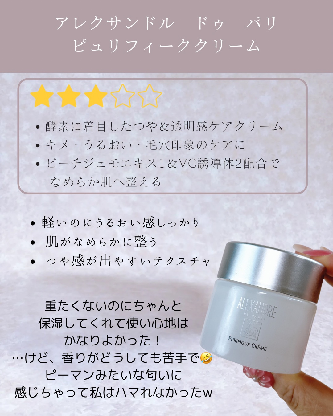 色んなの使ったけど最近はもうこれに落ち着きました。前は3個ぐらいを季節によって使い分けてたけど今は年中これ!!!本当水々しくて使いやすいのよね。冬でも乾燥しないし毛穴落ちもしないし厚塗り感もなくて本当お気に入り。やっぱ君は最強よ!!!!てな、わけでしっかりレビューを始めます。色はカラレスでアイボリーっぽい色です。個人的に色が付いてると崩れた時に目立つような気がするのと元の肌の色に影響がないのでホワイト系の下地はおすすめです。肌補修はファンデとかパウダーでするのがグー!でも、カラー下地が良い方はバリエーションもたくさんありますので是非!おすすめは混合肌の方ですかね。あとカバー力はあんまりないですが、艶感は出るので仕上がりは満足です!間違いなく私の中では現在No.1下地です^^レビューは以上になります。少しでも参考になれば幸いです♪