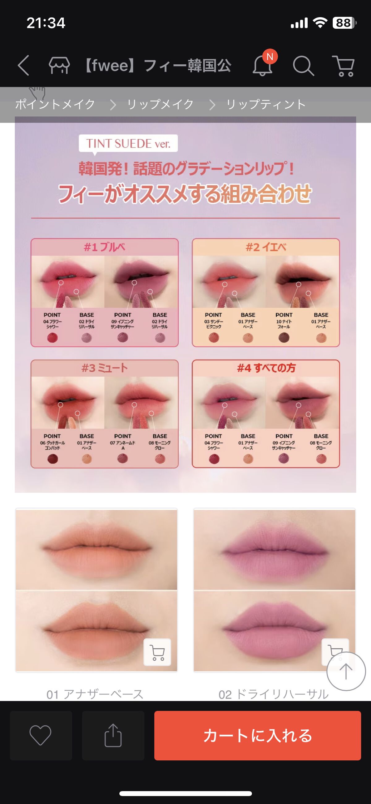 fweeフィーティントスエード02ドライリハーサル04フラワーシャワーQ10の公式ショップで2本で2,100円で買えました02ドライリハーサルはもっと青み強くてもよかったなふわふわの質感で塗り心地が良いです02ドライリハーサルと04フラワーシャワーを重ねるとかわいいリップになりました02ドライリハーサルだけだと少し顔が暗くなりますくすみが得意なタイプのブルベの方だと02だけで使っても似合いそうです短いので嵩張らなくて良いです画像3枚目はエチュードのフィキシングティント COOKYオントップとの比較ですエチュードの方が青みが強いのでこれだけでも顔色が暗くなりませんやっぱり青み吸収型ブルベはより青みの割合が高い色が必要ですね