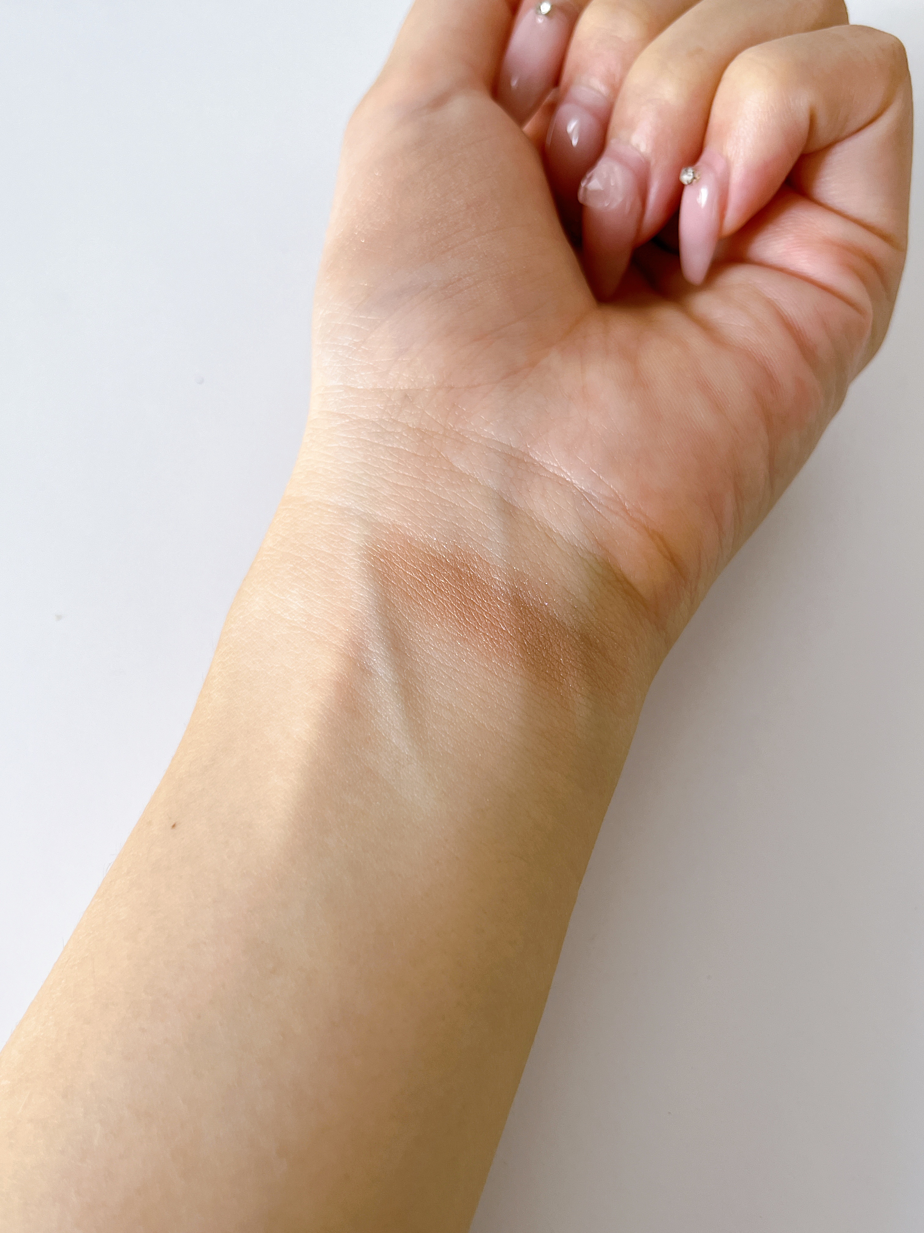 芯のあるダークブラウン ココアのような色。ブラシで塗ると、見た目より発色は弱めかな? 濃くつけたい時は指でつけています🫶 セミマットとのことですが、細かいパールが入っていて、ツヤ感があります。しっとりした粉質で粉飛びしにくかったです。