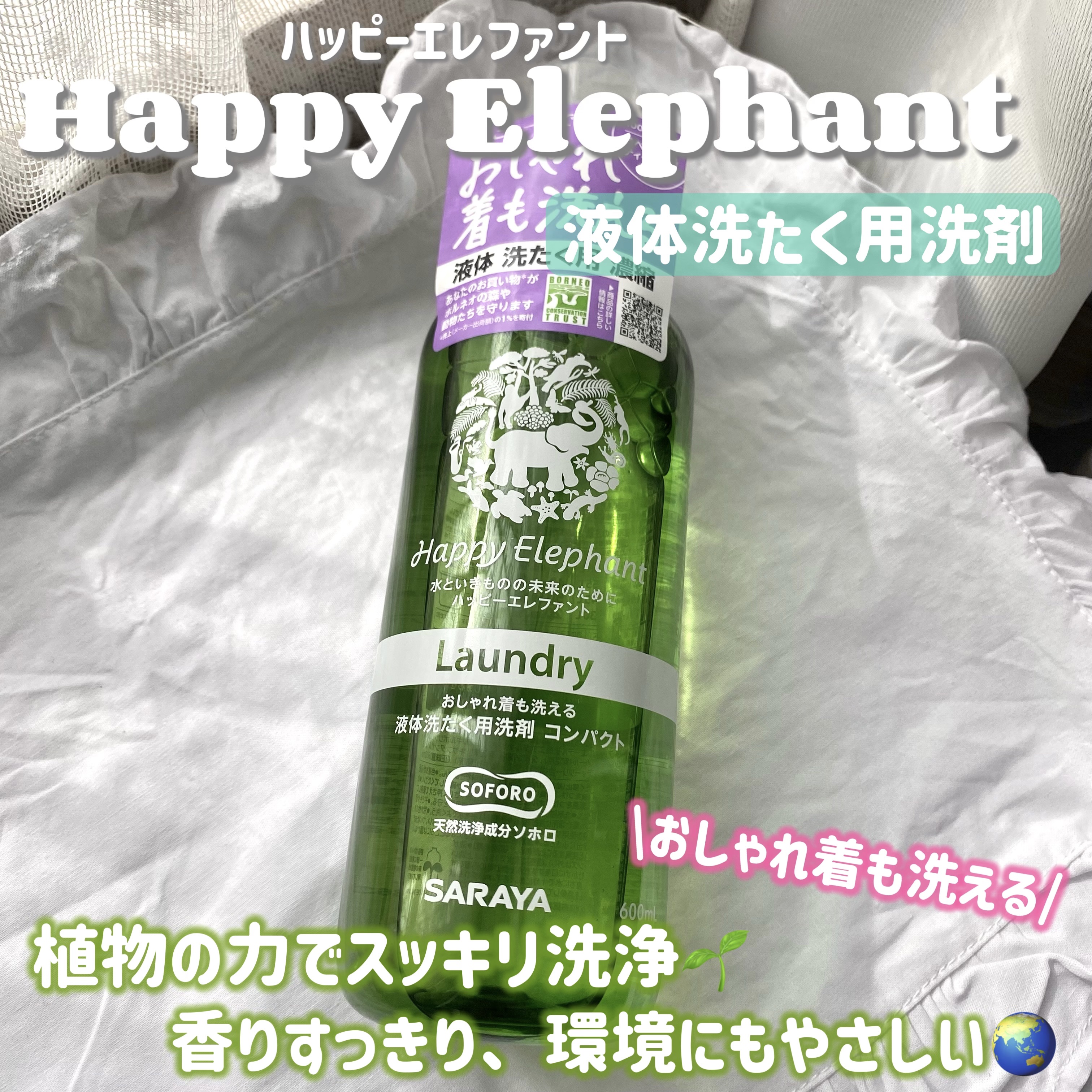 👉🏻SARAYA様より提供頂きました🙇♂️✨【SARAYAハッピーエレファント液体洗たく用洗剤】\これ一本でおしゃれ着(*1)も洗たくできる🧺/✔︎︎︎︎天然由来原料配合🪴(天然洗浄成分ソホロと非石油系の植物性洗浄成分で作られたナチュラル洗...