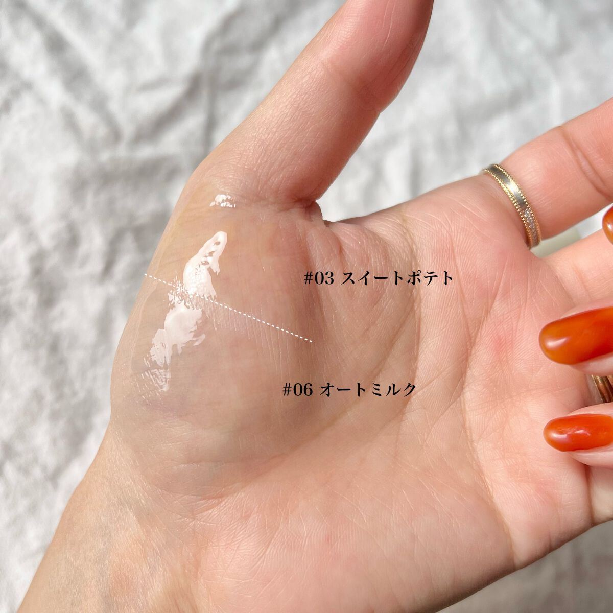 カラー・香りは全5種類♡ 03 スイートポテト ほんのりイエローを感じさせるカラーで、塗るとほぼ透明に近い💛まるで本物のスイートポテトの香りでびっくり🍠❕ 06 オートミルク 見た目はほんのりミルクカラーで塗ると透明🧊 ポン菓子みたいなふんわり甘い香りでこれもリアル.ᐟ.ᐟ 香りがリアル過ぎて塗ったあともいい香り〜♡♡ テクスチャーはややもったりしていて、ぷっくりツヤツヤにも仕上げられる!食事の後やティッシュオフ後もしっとり感が長続きしてくれる! 唇の古い角質をやわらげ、縦じわを目立ちにくくふっくらとした唇へ導いてくれるので、乾燥し荒れがちな唇におすすめ! 普段のケアとして使いやすいクリアなカラーで、おやすみ前にも使いやすい◎!