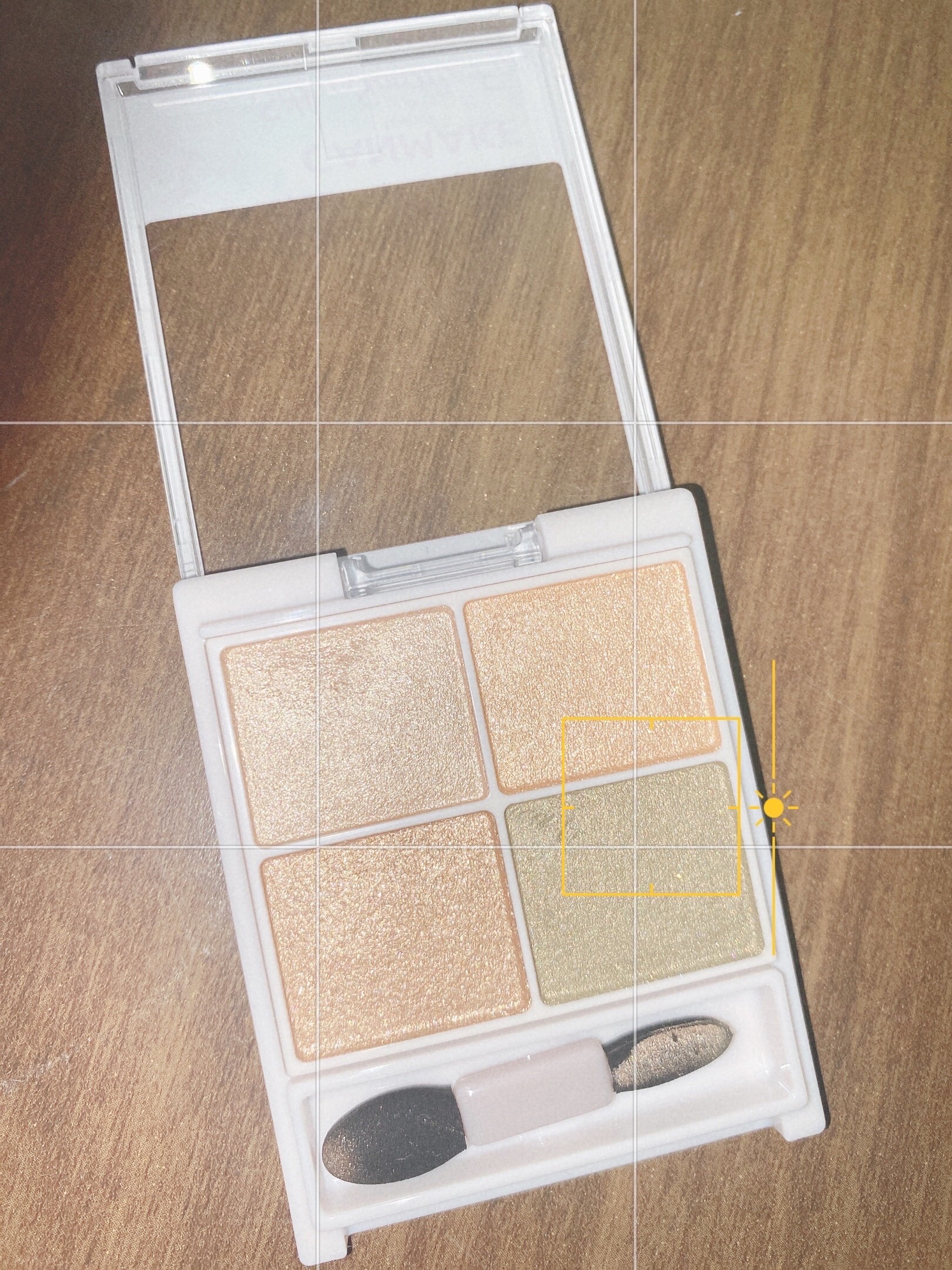 ゴールドラメとサテンの質感が楽しめるアイシャドウです。 サテンっぽい仕上がりになるのはカーキの部分だけです。 左上をアイホール全体にのせて右上をまぶたの目頭に、そして二重幅の半分の幅に右下をのせると綺麗に仕上がります。 ゴールドのラメが主張するので、毎日メイクにはあまり向かないかも。 でも大好きなアイシャドウです🧡