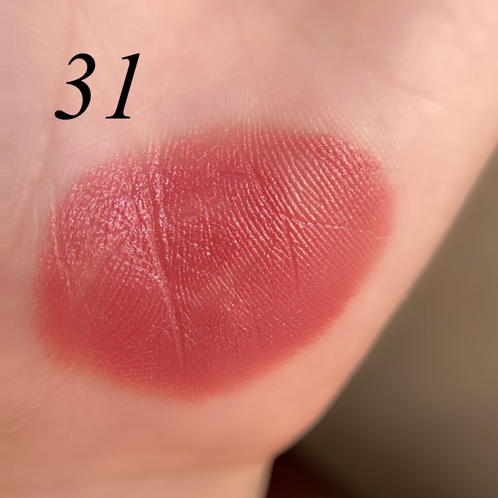 色は【29】と【31】をチョイス✨ どちらもサテンタイプで濃密な発色と、光沢感によるサテンのような質感が特徴💡 しっとりとした使い心地で、マスクにつきにくいのも嬉しい⭐︎ 程よいツヤ感があるので、そのままでも良いしグロスを使うとまた違った印象も楽しめる😋 【29】は唇よりも薄めなピンク味のベージュ! やわらい印象で、仕事にも遊びにも使いやすい☺︎ グロスを使うと色っぽい雰囲気にも💜 【31】は深みのあるピンクベージュで、やや赤みがあるように感じます😌 きちんと感もありつつ、可愛い印象にも見える素敵な色でした!