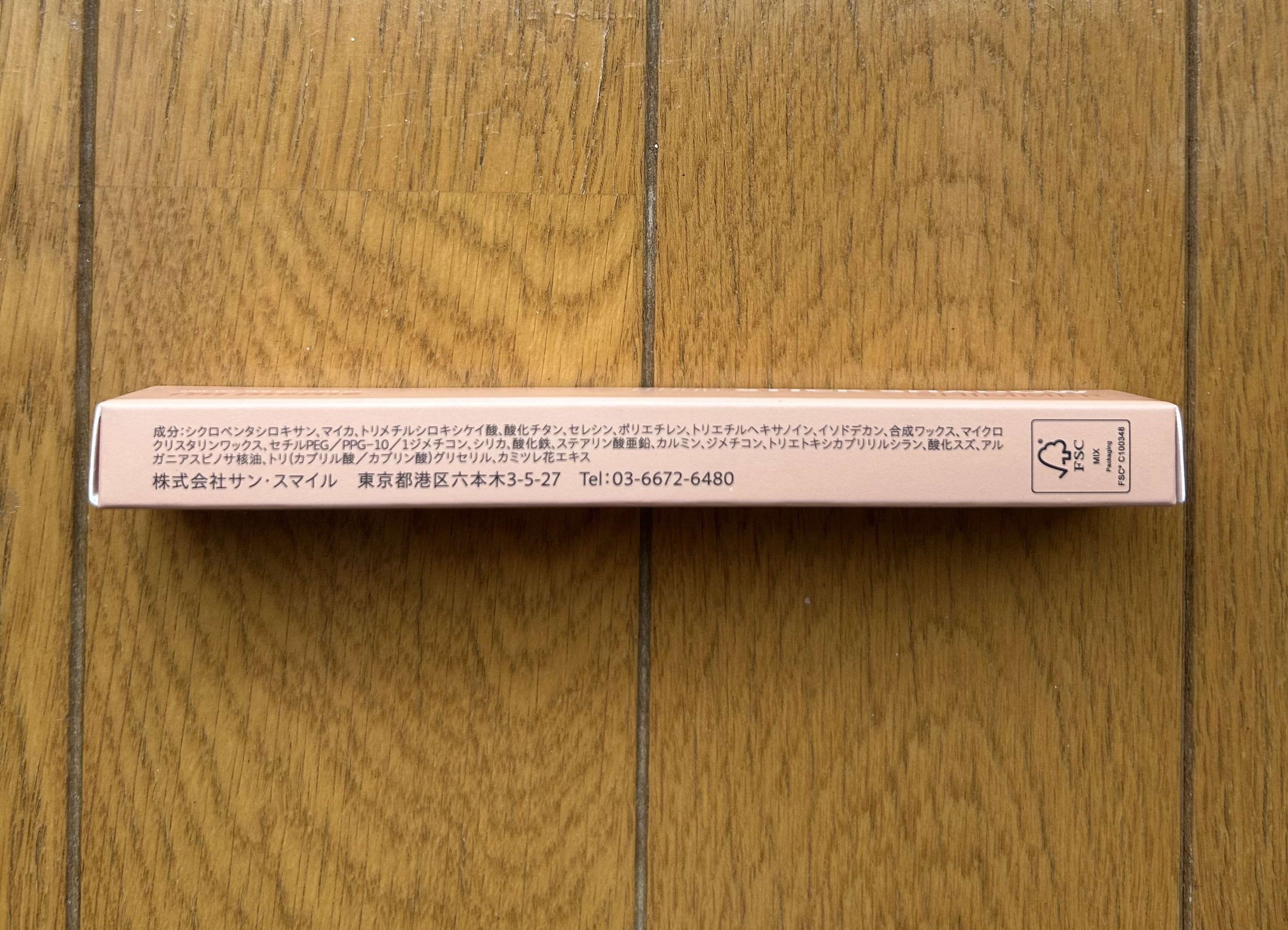 - シクロペンタシロキサン、マイカ、トリメチルシロキシケイ酸、酸化チタン、セレシン、ポリエチレン、トリエチルヘキサノイン、イソドデカン、合成ワックス、マイクロクリスタリンワックス、セチルPEG/PPG-10/1ジメチコン、シリカ、赤酸化鉄、ステアリン酸亜鉛、カルミン、ジメチコン、トリエトキシカプリリルシラン、酸化スズ、アルガニアスピノサ核油、トリ(カプリル酸/カプリン酸)グリセリル、カミツレ花エキス