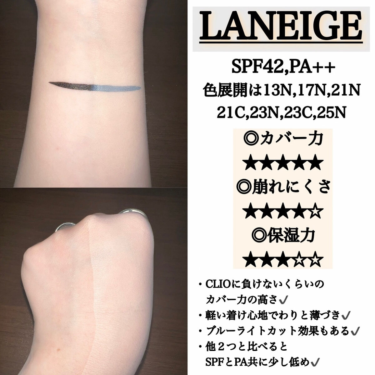 こんにちは!ちむです🌞🌝投稿が遅くなってしまいすみません💦私の投稿がみなさんの参考になれば嬉しい限りです😭いいねとフォローお待ちしております➰フォロバするのだよ〜〜〜❣️👇🏻早速1つ目の商品紹介です👇🏻📍1つ目の商品(画像2.3枚目)→CLIO:キルカバーファンウェアクッションオールニュー(02-LINGRIE)📛感想→私的カバー力部門No.1✔️→カバー力も密着力も高く、崩れにくい✔️→崩れても汚い崩れ方じゃなくて綺麗な崩れ方✔️→ただ私が敏感肌+乾燥肌なので保湿力はそんなに、、って感じだった✔️→保湿力に関してはメイクをする前にしっかりと保湿してあげることで補える✔️→色展開も豊富で自分に合う色を探せる✔️→標準より少し色白の私は2番のLIGERIEでも丁度良かった✔️📛どんな人におすすめか→何がなんでも今日は崩したくないって方に✔️→カバー力も崩れにくさも兼ね備えてるクッションファンデが欲しいという方✔️→とにかくカバー力重視!という方✔️👇🏻続いては2つ目👇🏻📍2つの目の商品(画像4.5枚目)→LANEIGE:ネオクッション(マット-21N)📛感想→薄づきだけどカバー力が半端ない✔️→見た目もかわいい✔️→パフの部分に切れ込みが入っているからパフでファンデの量を調節してくれるから厚塗りにならない✔️→CLIOと同じく保湿力はあまり感じられなかった✔️→ブルーライトカット効果あり✔️→SPFもPAも少し低めなので日焼け止めやUVカット効果のある下地を使うと良き✔️→こちらも色展開が7色あるので自分の肌に合う色が見つかりやすいかも✔️📛どんな人におすすめか→ブルーライトが気になる方✔️→薄づき+カバー力が欲しいという方✔️→ファンデーションの量の調節が難しくて困ってるという方✔️👇🏻続きましては3つ目👇🏻📍3つ目の商品(画像6.7枚目)→TIRTIR:マスクフィットオールカバークッション(21N-アイボリー)📛感想→赤のTILTILと同じく厚塗り感が出やすい✔️→崩れにくさは他のクッションファンデに負けないくらい崩れない✔️→黄味が少し強めな印象✔️→薄い膜を何層も作るイメージで塗ると綺麗に仕上がる✔️→これまたこちらも私はあまり保湿力を感じられなかった✔️→肌が綺麗に見える✔️→使ってみると人気な理由がわかる✔️→マットよりのセミマット仕上がり✔️→密着力が高い✔️📛どんな人におすすめか→カバー力が高いベースメイクを求めてる方✔️→マスク汚れが気になる方✔️→長時間マスクをしていても崩したくない方✔️→さらっとした仕上がりが好きな方✔️以上でクッションファンデーション(カバー力部門)は終わりです🌟最後まで見てくれてありがとうございました🫧参考にして頂けると幸いです🫡#やっぱこれやねん#正直レビュー#clio#キルカバー#laneige#ネオクッションファンデ#tirtir#マスクフィットオールカバークッション#クッションファンデーション#オススメファンデ#カバー力のあるファンデーション#カバー力