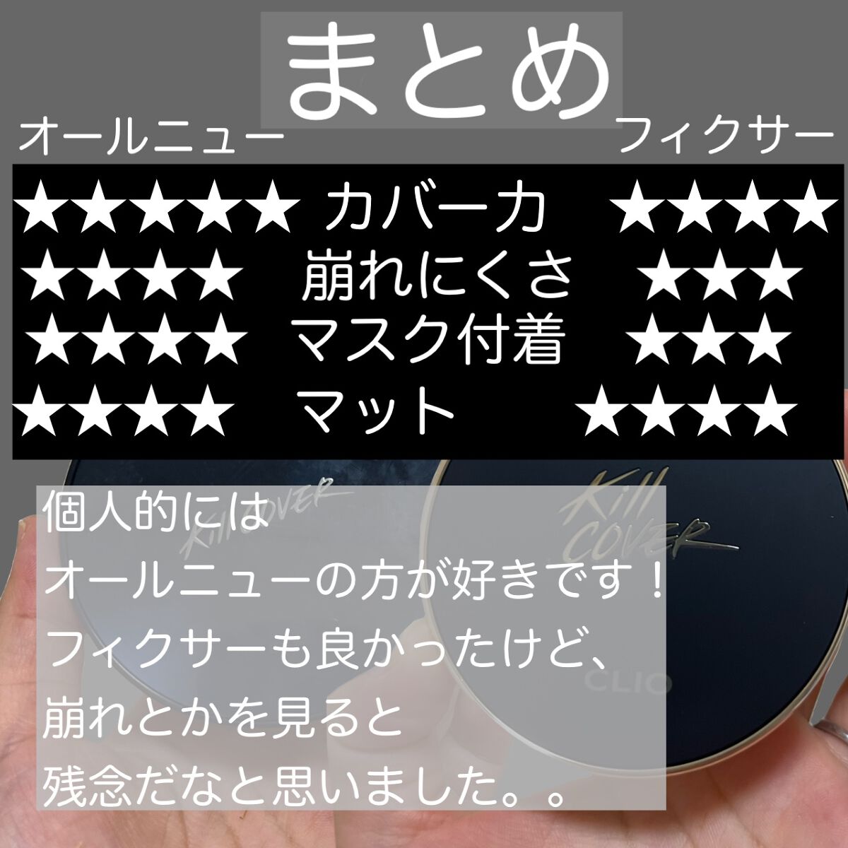 #本音でガチレビューこんにちは!全く投稿出来ず申し訳ないです。。やっと!比較画像できたので投稿します。✂ーーーーーーーーーーーーーーーーーーーー今回比較するのは、、○CLIOキルカバーフィクサークッション○CLIOキルカバーファンウェアクッションオールニュー3.5VANILLA✂ーーーーーーーーーーーーーーーーーーーー今回もいつもと同様マスクをつけてお仕事をして何時間かごとに経過を見て崩れているか見ていきます。[つけた後]・フィクサーめっちゃ高いわけではなかった!でも綺麗な仕上がりで良かった!鼻に子供に引っかかれた傷があってそれは隠れず、・オールニュー塗ってると塗ってないとでは全然違うくらい肌を綺麗にしてくれてました。[約4時間後]・フィクサー鼻の周りがテカリがで始めた・オールニューこちらも鼻周りにテカリが見えてきました。ただニキビは隠れたままでした。[約9時間後]・フィクサーマスクの擦れやすい頬のあたりが崩れが目立ってきた!・オールニュー鼻と頬の崩れが見えてきた!でも、そこまで崩れは目立ってない。。ニキビは見えてきました。。[約12時間後]・フィクサー口周りと鼻は完全に取れてました。・オールニュー取れるまでは行かないけど崩れが目立ってきた!どちらもやっぱり崩れます!マスクしてるし、、ですけど崩れはどちらも綺麗に落ちてました!化粧直しのタイミングは、どちらも朝つけた場合は、お昼頃がおすすめ!お直しすると長持ちするのでおすすめです。✂ーーーーーーーーーーーーーーーーーーーーまとめ【崩れにくさ】・フィクサー ★★★・オールニュー ★★★★【カバー力】・フィクサー ★★★★★・オールニュー ★★★★【ツヤorマット】・フィクサー セミマット・オールニュー セミマット【良いところ】・フィクサーオールニューよりかはカバー力ないけど厚塗りになりにくいところがよかった!初心者向けかなと思いました。・オールニュー何もかも完璧。一度でカバーされるほどカバー力もある!【イマイチなところ】・フィクサー崩れが目立つのがオールニューより早い。。マスクにつきやすい。。・オールニュー悪いとこ無い、、長文ですいません。どちらもよきでした!CLIOさんありがとうございます。。#CLIO#クッションファンデ#プレゼント企画_CLIOJAPAN
