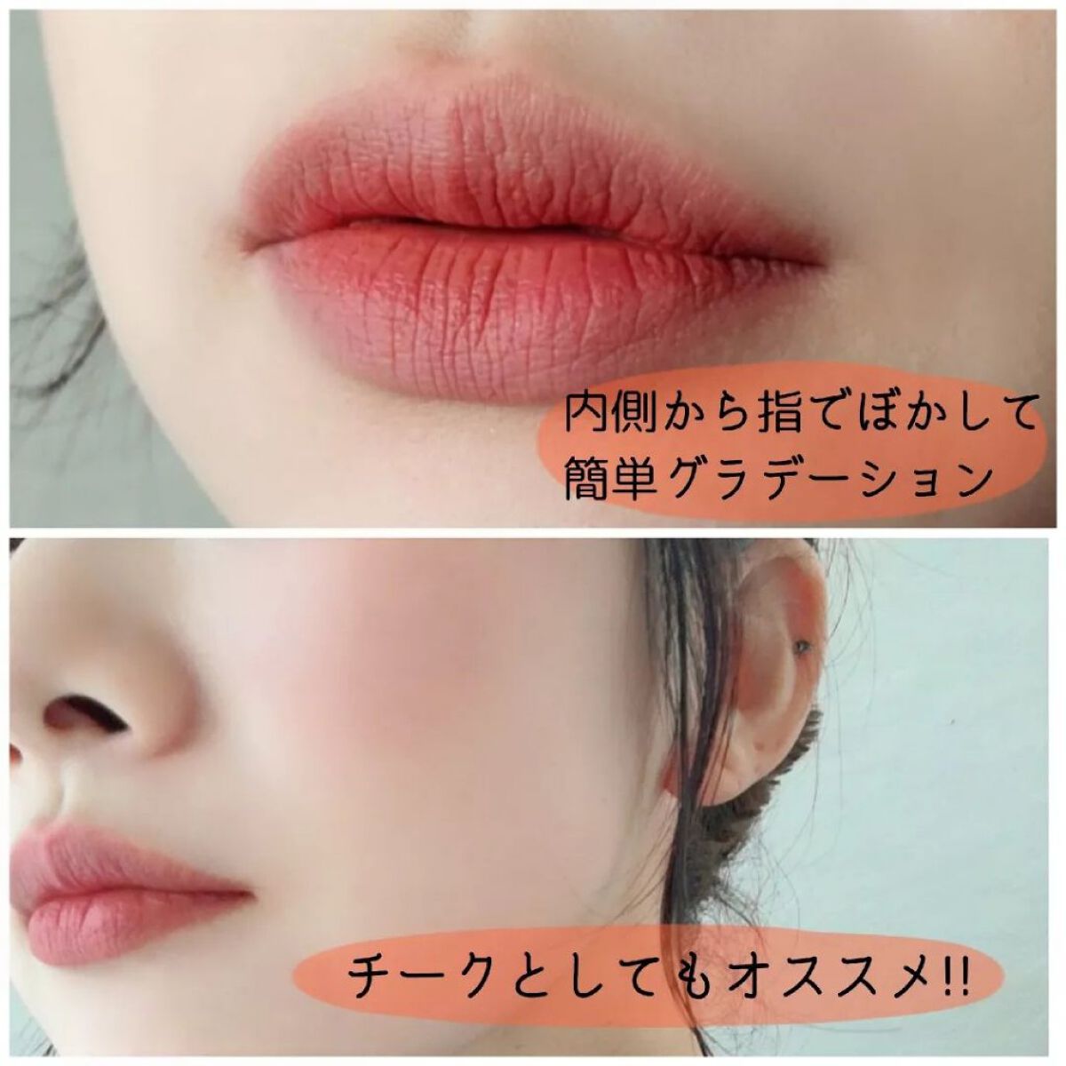 薄づきでも発色がよく、しっかり染まる! 乾燥はそこまで感じない🙆♀️ ちょうどいいセミマットな仕上がりで、 ティッシュオフすればマスク移りも少なめ🌟 サラサラマットなパケも可愛い♡♡ 結構パキッとしたカラーが多めだけど 9AMは1番好みで使いやすかった🤩👍!