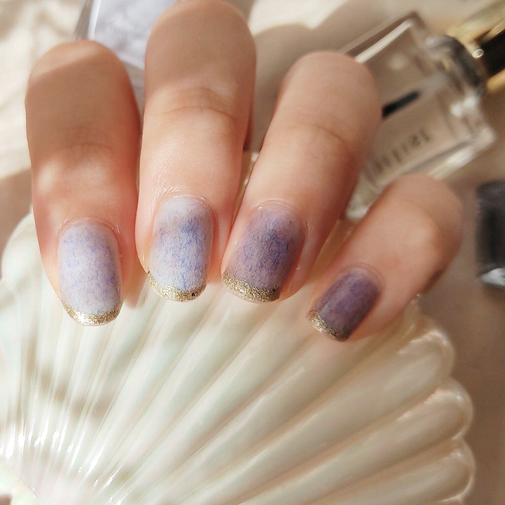 2色とも寒色系の繊維入りネイルポリッシュめっちゃかわいい。 35は透明感が強いのでベースに別の寒色系のカラーを使うのがおすすめです〜 39は暗めの青+紫がベースです。35に比べるとめっちゃ濃いベース! 最初のネイル画像ではParaDoの去年くらいの淡いくすみ水色に少しパールが入ってるカラーを使ってます。 指先のフレンチはネイルホリックのゴールドラメ。 筆が習字とかの細筆タイプになってます。 トップコートはネイリストのやつ!2~3度重ね塗りしてます💙
