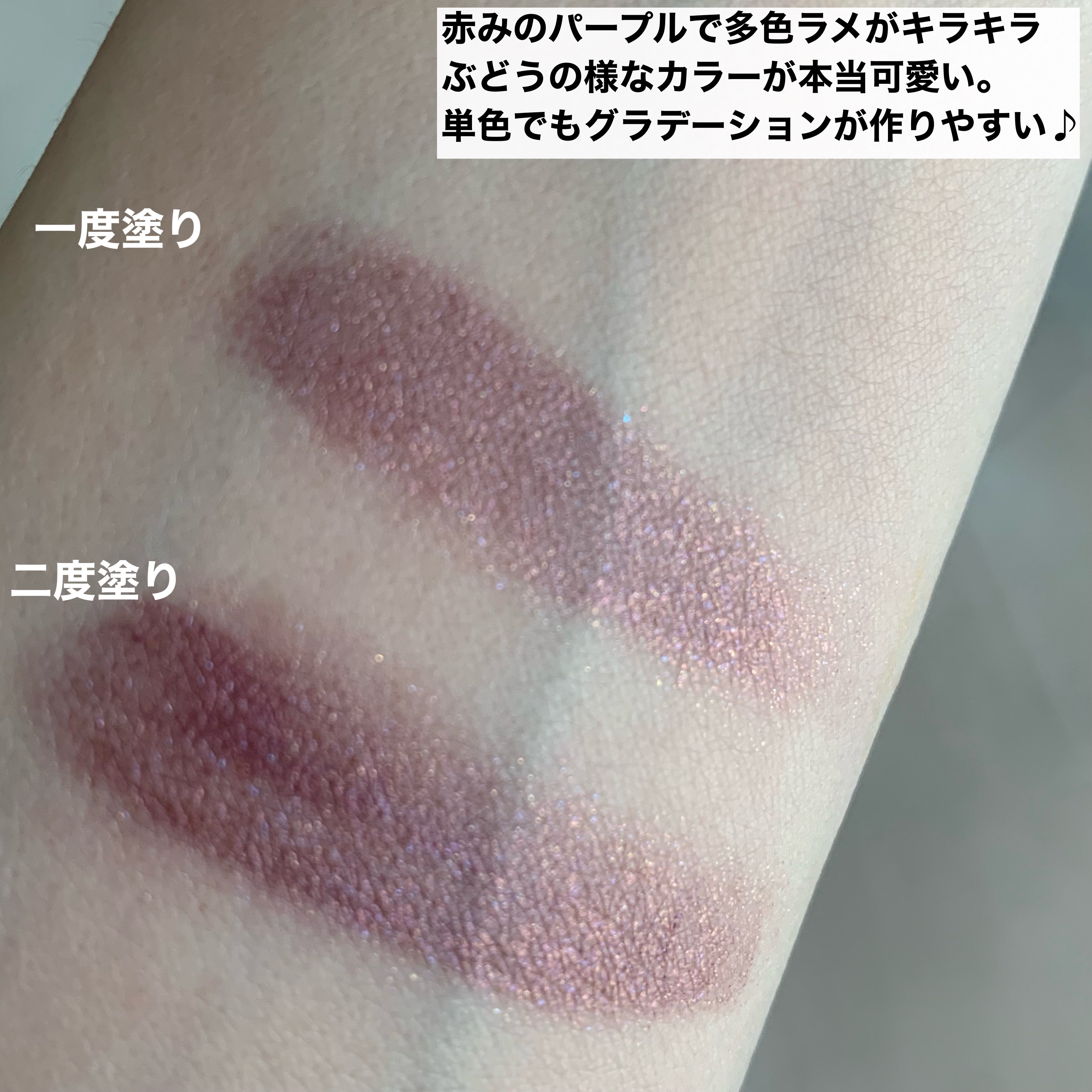 ぶどうカラーの赤紫でかなり秋っぽくおすすめです! 深めの色味に見えますが、薄く伸ばすと細かい多色ラメが際立ち透け感のあるぶどう色になります。 特にピンクラメが目立つので、ピンク系のメイクが好きな方に是非使って欲しいです♡ ラメが本当に本当にかわいいので、狭く濃いめに載せるよりも指で取って薄く広めに載せるのが私は好きです☺︎