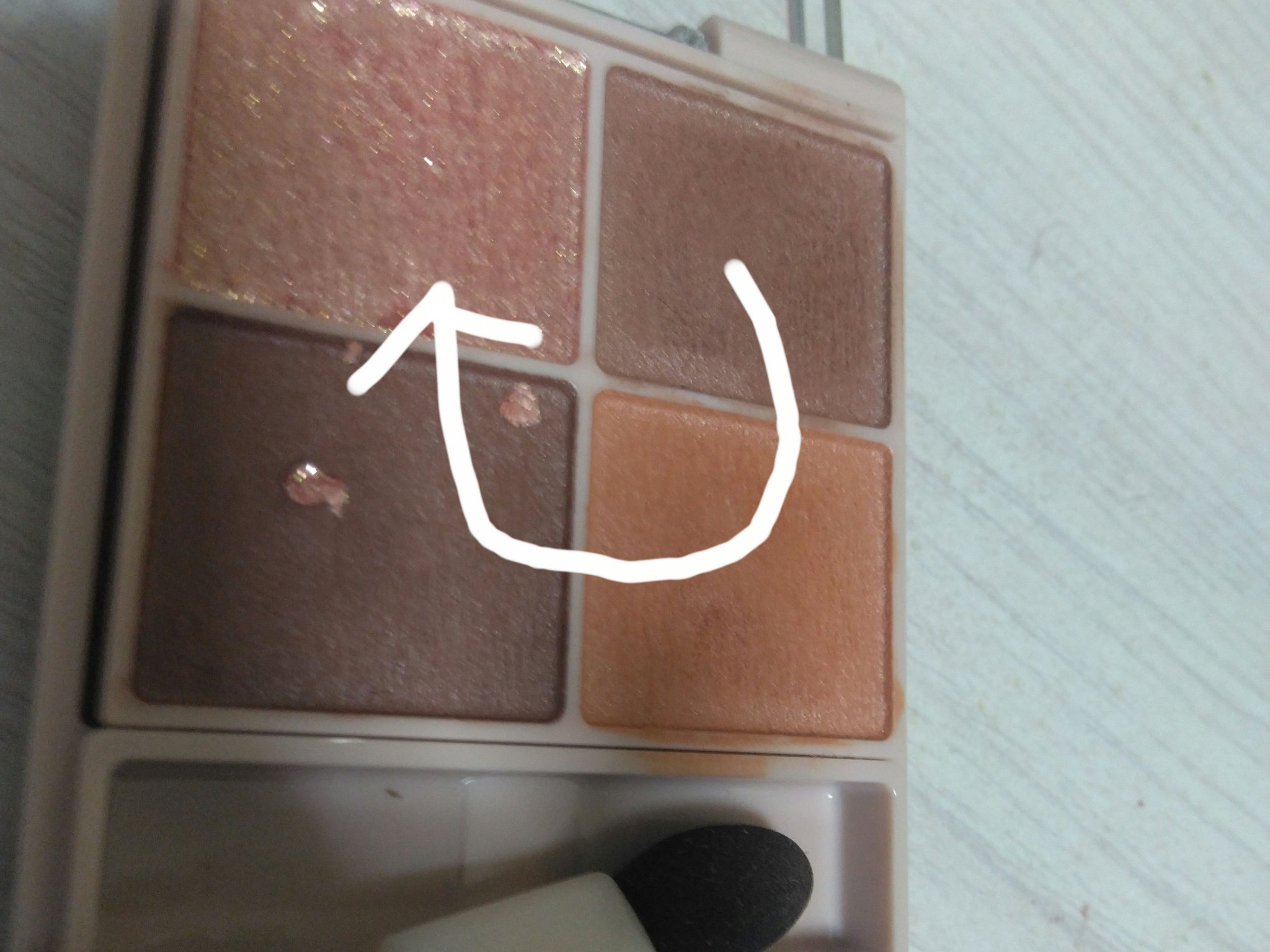 使いやすそうな色味で買ってみたアイシャドウ ふんわり発色で可愛いけど、、 一度ではっきり発色してほしい人にはオススメできません🥲 3色マット+ラメがついていて1つのパレットでメイクできるので使いやすいのですが、好みは分かれるかもしれないです🤔