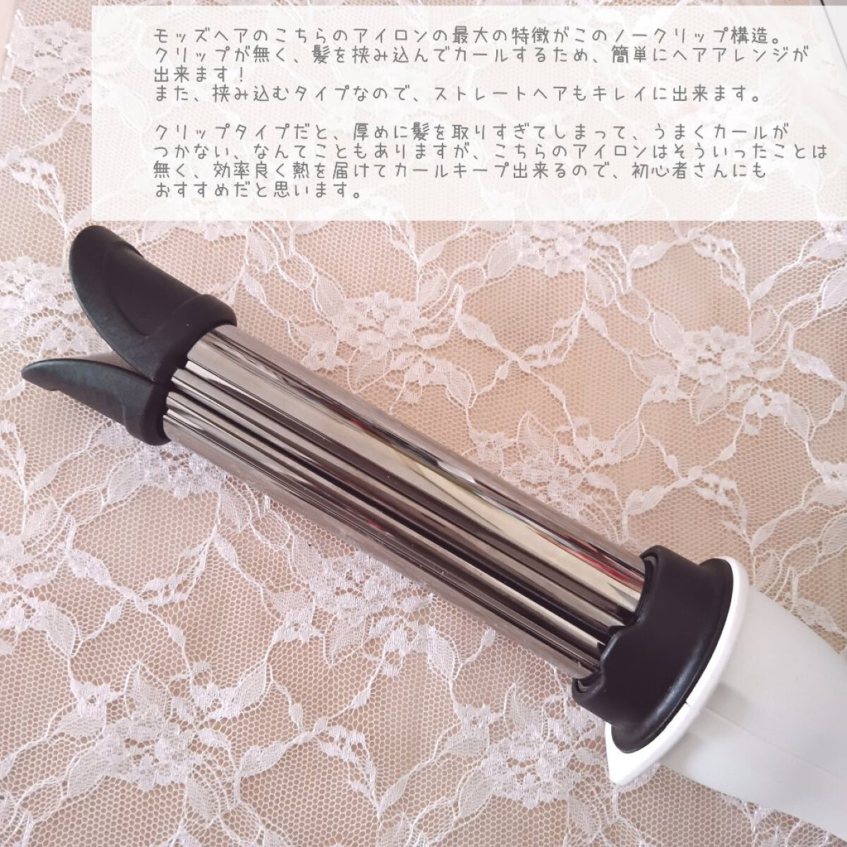 モッズヘアのこちらのアイロンの最大の特徴がこのノークリップ構造。 クリップが無く、髪を挟み込んでカールするため、簡単にヘアアレンジが出来ます! クリップタイプだと、厚めに髪を取りすぎてしまって、うまくカールがつかない、なんてこともありますが、こちらのアイロンはそういったことは無く、効率良く熱を届けてカールキープ出来るので、初心者さんにもおすすめだと思います。 適量挟んで巻き込むだけでヘアセット出来るので、不器用でも初心者でも、誰でも簡単にしっかりヘアアレンジが楽しめます。 ブロッキングした髪を細かく取ってアイロンをかけるのは、正直手間だなーとも思いますが、挟み込んでくるくるっと回すだけで、キレイにカールをかけられるので、その手軽さはすごく魅力的だと思います。 ストレートもこちらでキレイに仕上がるし、ひとつ持っていれば、あれこれヘアアレンジが楽しめちゃいます!