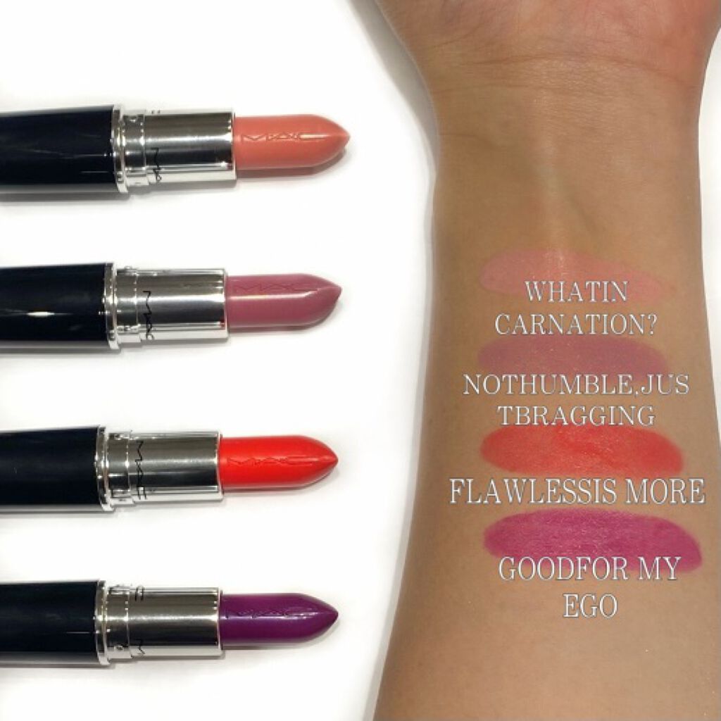 【第3段♥フローレスイズモア(限定色)】8月16日に新発売のM・A・Cラスターガラスリップスティックを3弾に渡って紹介します!まず、マスクにつきます。(笑)しかし塗り心地は抜群!スルスル塗れて、M・A・Cのリップスティック(紹介済み)は唇が少しでもフラットの状態じゃないとムラのようになってしまいますが、ラスターガラスリップスティックはそんな事はなく、均一に濡れるのが見た目が非常に綺麗です!ラスターガラスリップスティックを使用する際はティッシュオフからのポンポン塗りにしてますが、個人的には1度塗りだけで終わらせたい!だって最強に可愛いんだもん!マスクさえなければ!🤬⬆️ここまでは、3弾全ての共通文です。⬆️お待たせしました!フローレスイズモアの紹介です!まずこちらは限定色になります。限定色は最後に載せた画像の4色になり、限定色の中でも1番使いやすいカラーがフローレスイズモアです。購入した3色を並べると1番赤みが強いのかなと思います。色味はシーシアーに似ていますがフローレスイズモアの方が明るい赤で朱色感があります。シーシアーよりもカジュアル感が強いので顔に色味を持って来たい時や明るさをプラスしたい時はフローレスイズモアの出番で、仕事の時はシーシアーで使い分けようかな🧐以上でラスターガラス3色の紹介は終わりです!お付き合いありがとうございました🙇♂️今回ラスターガラスを購入して、改めてM・A・Cのリップにどハマりしそうなのでまた別のものやラスターガラスを紹介します💄💕そしてラスターガラスのレビュー件数が少ないのでなにか参考になれば嬉しいです!個人的に好きなカラーの順番は、パウトオブコントロール>シーシアー>フローレスイズモアかな?使いやすさ的にはシーシアー>フローレスイズモア>パウトオブコントロール。どれも可愛いので今日はどれにしようかな、なんてリップから始めるメイクもありかなと思いました🥰#mac_リップ#mac#ラスターガラス#リップ#限定色#秋冬メイク#エッセンシャルでキメハート#今月のコスメ購入品#殿堂コスメ#私の眉毛事情#メイクの秋#やっぱりツヤ肌が好き#沼るコスメたち#動画で毎日メイク#アウトバスルーティン