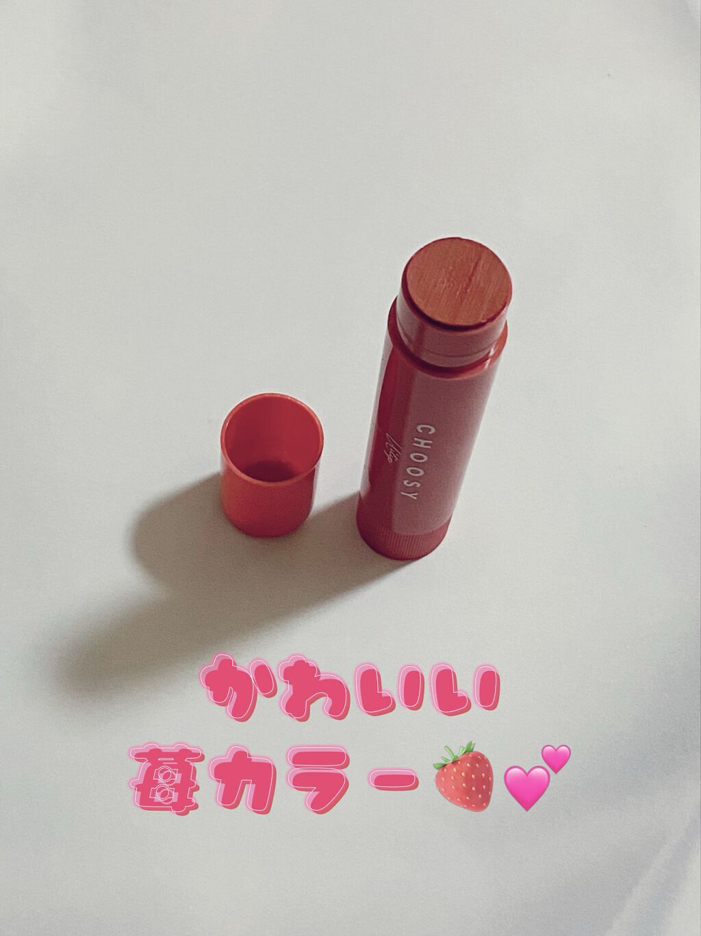 正直全然、ういういしい仕上がりではない😂むしろ、こなれ感すら漂うんですけど。CHOOSYカラーケアリップいちごタルト税込462円💰────────────こちらのリップは、「学校でもバレにくい♡」「こっそり血色唇に♡」「はじめてのぷるぷる感♡」と謳われているので、きっと若い子向けのアイテムだと思うのですが、今回はご縁があって30代の私のところにも来てくれました✨写真には撮ってないけれどまず外装からとっても可愛いし、お値段もワンコイン以下という可愛らしさ。甘〜いイチゴの香りが強めに香る所も、なんか若々しくて良いなーと使う前からニヤニヤしていたのですが、、、塗ってびっくり!なんか全力で発色してる!✨勝手にニベアのカラーリップとかと似た感じ(うっすら発色ツヤツヤ系)を想像してたんだけど、全然違いました♡笑カラーケアリップって商品名が不似合いすぎなぐらい、ガッツリ赤。これはルージュだよ、ルージュ💄全然こっそりじゃないし、学校でもバレバレ間違いなしです♡“はじめてのぷるぷる感”も私にはよくわかりませんでした。確かに多少のツヤは出るものの、“ぷるぷる”からイメージされる立体感や水光感はゼロに等しいのではないでしょうか。。。若い子の唇に塗るとまた違うのかな?おばはんのしぼんだ唇のせいかな?てか、いま公式の画像見てきたけど、同シリーズのブラウンカラー“ガトーショコラ”だったら私 この高発色ゆるせるかも。むしろ好きかも....‼︎✨また機会があったら使ってみたいな♡♡何はともあれ、この度は普段 自分では選ばないであろうリップをお試しできて良かったです♡♡追記▼『ういリップ』って名前から、『ういういしい』を勝手に連想してレビューしてしまったけど、プロデュースした方の名前が『うい』さんなのね、、失礼しました😢情弱おばさんっぷりを露呈してしまって恥ずかしい限りです💦