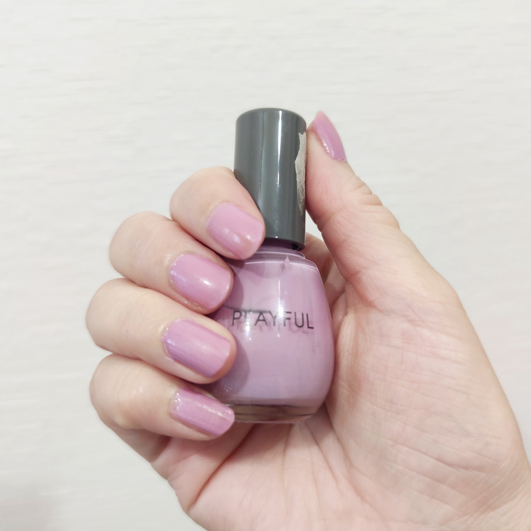 ネイル塗るのヘタなので、よく見たらムラができてるんだけど、人には気づかれないレベルなんじゃないかなぁっと思います。 このライラックの色味なんですけど、いろんな人のレビューで、めちゃくちゃ紫なんですけど、私が塗るとどっちかというと青みのあるピンクです。 でもかわいいピンク。かわいすぎないのはやっぱり青みがあるからかな。
