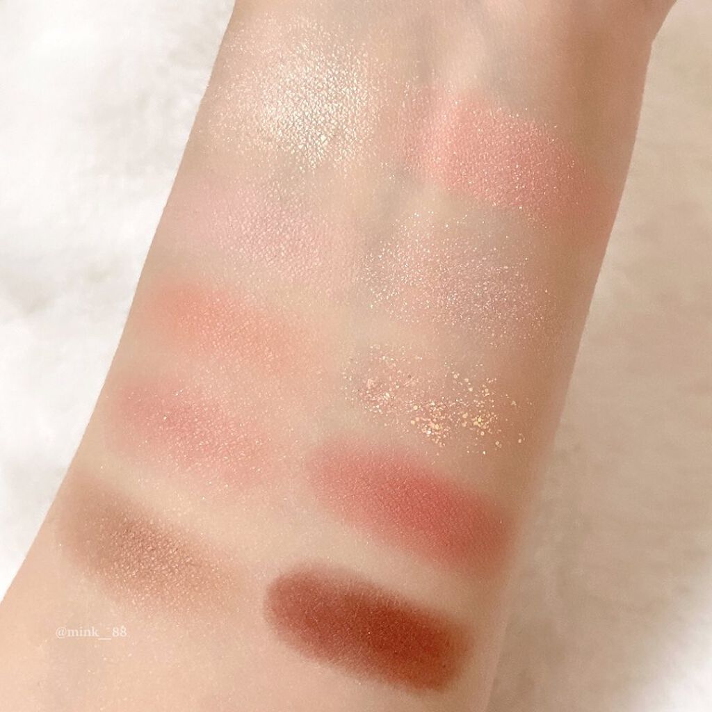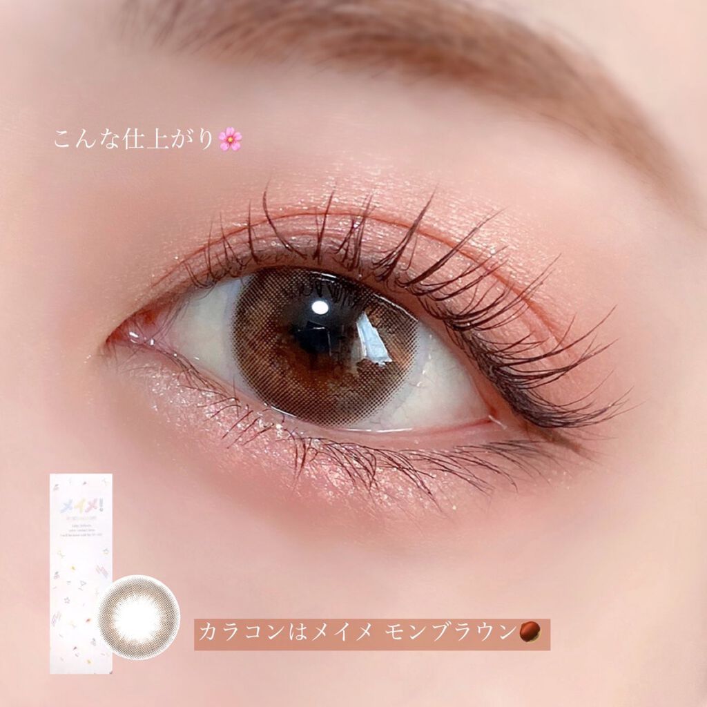 あんまり発色が良すぎると腫れぼったく見えちゃうけど これは発色が強すぎないからふんわりと コーラルカラーが楽しめる🌷 グリッター、ラメも他の韓国コスメのアイシャドウと比べると めちゃくちゃギラギラ!って感じじゃないから ちょっとキラキラ感足したい時に 使いやすいと思います👀✨ カラコンはメイメ モンブラウン🌰 暖かみのあるナチュラルなブラウンカラコン♡