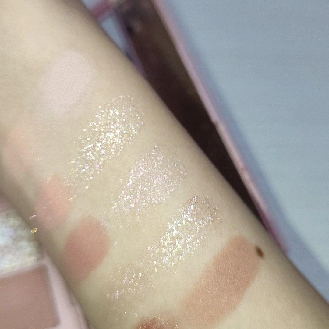 粉とびは全くないです! 発色がいいのでとても使いやすいです! ピンク系もコーラル系もあるのでイエベさんもブルベさんも両方使える色です! 1の色→マットの薄いピンク色のアイシャドウです。 2の色→ピンクと青と黄色のラメが混ざっているラメです。 3の色→ピンクのラメの中に青と黄色のラメが少し入っているラメです。ほとんどピンクのラメです! 4の色→2の色のラメの大粒バージョンです。 5の色→茶色っぽいコーラル系のアイシャドウです。 6の色→ほぼ肌色です。肌馴染みがとても良いアイシャドウです。 7の色→オレンジ色のアイシャドウの中に黄色とオレンジのラメが少し入っているアイシャドウです。 8の色→濃いピンク色のアイシャドウです。 9の色→3の色のピンクのラメが少し少ないバージョンのラメです。 10の色→茶色のアイシャドウの中に黄色、ピンク、青のラメが入っています。