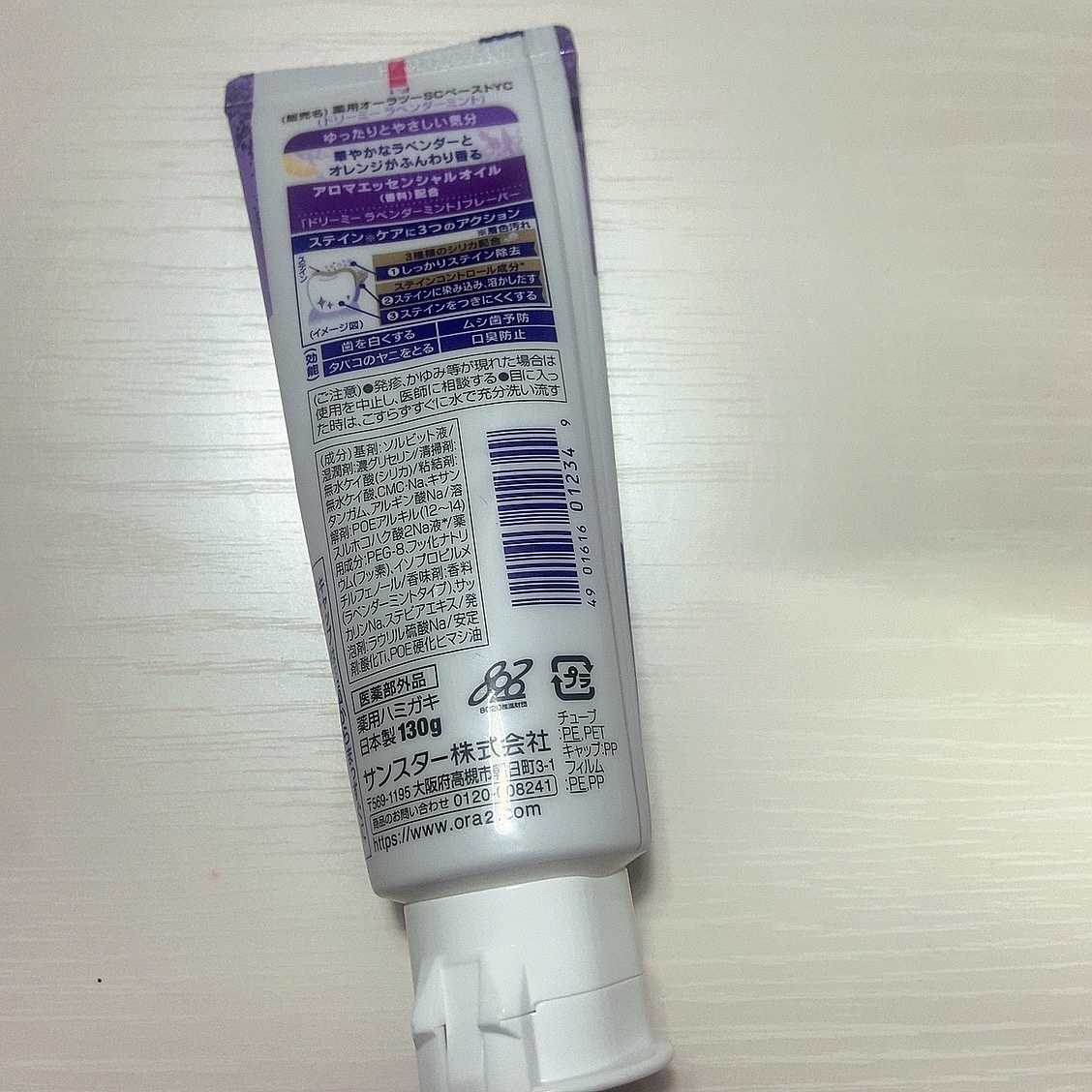 アロマエッセンシャルオイル(香料)配合のアロマなハミガキ♪ 3種のアロマフレーバーがあり使っているのは“ドリーミーラベンダーミント”。 ラベンダーに、オレンジやカシスが深みをもたらすゆったりと心地よい幸せな香りなんだそうでマイルドなミントの爽やかさも合わさって辛すぎず心地の良い磨き心地ですね。 ステイン(着色汚れ)をオフして歯本来の白さへ導いてくれるという特徴もあるそうでアロマフレーバーの心地良さとともに気に入っています。 華やかで可愛いパッケージと心地良いフレーバーそしてステイン(着色汚れ)オフということから職場での昼みがきにも使っています。 夜に使うのもいいですが、昼みがきにもぴったり♪心地良いフレーバーの磨き心地で昼のハミガキ時間を楽しみお口も気分もリフレッシュして午後からの仕事に打ち込んでいます!