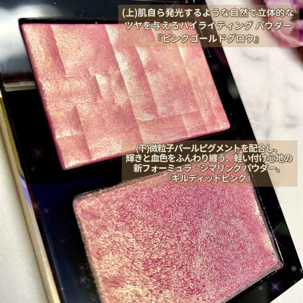 肌自ら発光するような自然で立体的なツヤを与える 「ハイライティングパウダー (ピンクゴールドグロウ)」 まさに内側から肌そのものが火照っているかのような血色感👏👏 ステキ。 好き。 微粒子パールピグメントを配合し、輝きと血色をふんわり纏う、軽いつけ心地の新フォーミュラ「シマリングパウダー (ギルディッドピンク)」 チークとして使うには、普段の私のメイクにはキラキラすぎるので、 アイシャドウのベースカラーとして使ったり、 涙袋に重ねたりしています☝️ めちゃくちゃ可愛いですよ💓