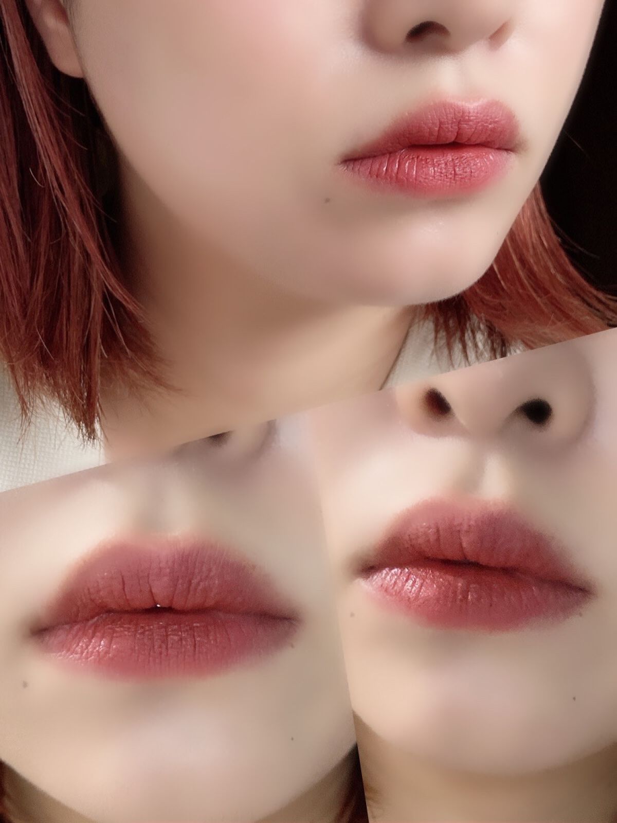 まず、つけ心地の軽さに驚きました.ᐟ.ᐟ わたしが持っているリップの中で一番軽いです⋆☽ それでいて乾燥を感じることがないので、マスクに向いているリップだと思います❤︎ 色味はパッケージのカラーと若干違いますね…。 パッケージはザ・ブラウン!って感じですが、実際の色味は赤みが結構多めです。 塗った瞬間、パウダーのようなスフレっぽく伸びてくれて、まるで指でぼかしたような『ふわっ』とした発色。 ぼでっと付きすぎたりせず、指で唇の輪郭をサッとぼかすくらいで良いのでめっちゃくちゃ使いやすくて、わたしはめちゃくちゃ好みです🤍´- マットですが、今までのマットリップの固定概念が覆すような新感覚的なリップでした✌︎ ✌︎ これは買って正解でした🙆♀️