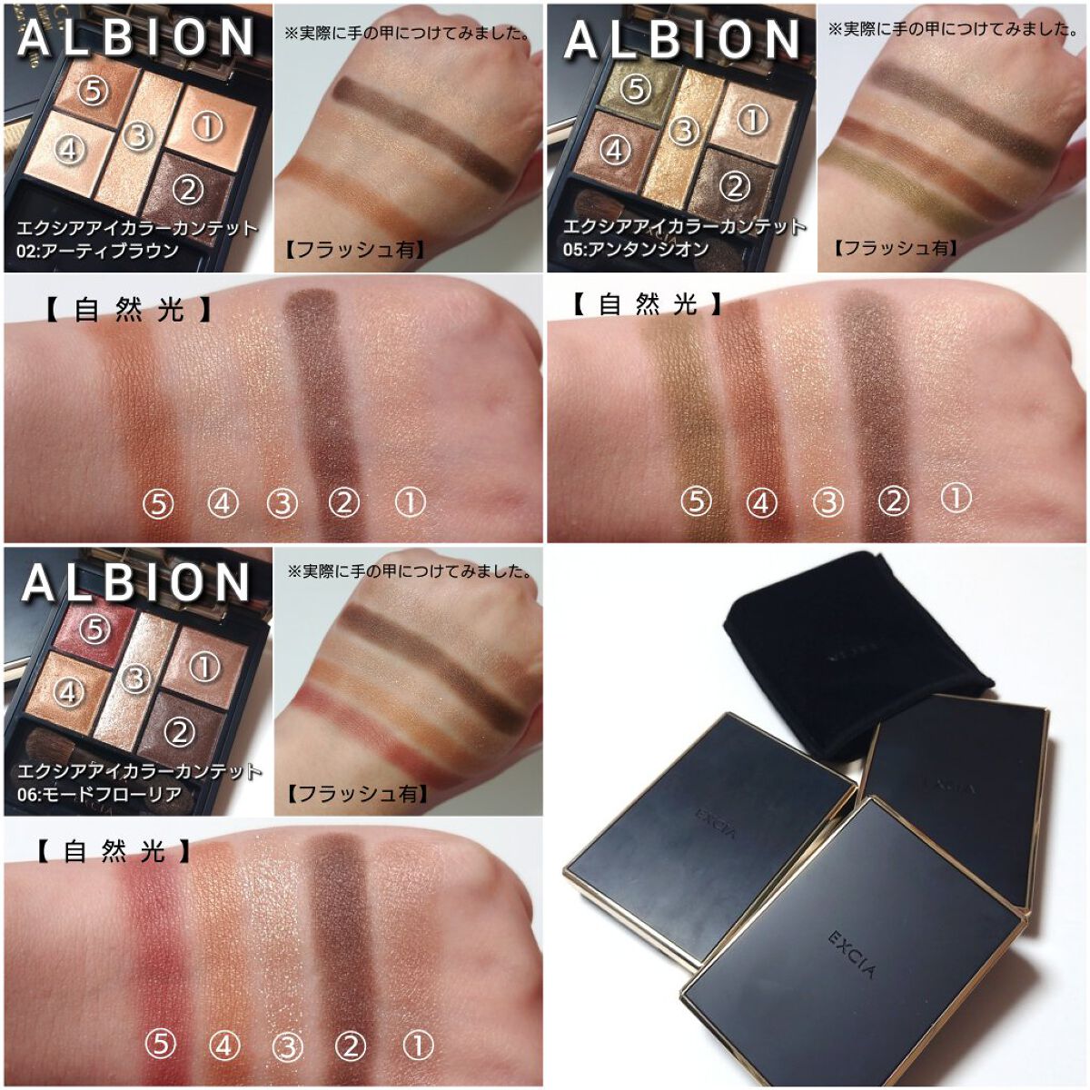 今回は、ALBION(アルビオン)の至高の濡れ艶アイシャドウ♥️「エクシアアイカラーカンテット」オススメ三大盛りカラーを徹底比較しながら、ご紹介していきたいと思います!!✨✼••┈┈••✼••┈┈••✼••┈┈••✼••┈┈••✼#ALBION(#アルビオン)#エクシアアイカラーカンテット・02:#アーティブラウン・05:#アンタンシオン・06:#モードフローリア各6,600円(税込)✼••┈┈••✼••┈┈••✼••┈┈••✼••┈┈••✼澄んだ発色と純度の高い輝き、透明感のオーラを纏うように瞼を彩る5色アイシャドウパレット。とにかく繊細な煌めきから織り成す「艶」が綺麗すぎて悶絶しました💓笑粉質は、優れたフィット力とオイルコーティング処方のお陰なのか、キメ細やか&しっとり柔らかで、上質なお粉なのが触れるだけで伝わってくる良質さ◎色を重ねていってもくすまないクリアな発色なので、グラデーションも作りやすく、時間が経ってもくすまず、透明感ある仕上がりをキープしてくれるので色持ちも優秀でした◎✨とにかく、澄みきったクリアな発色と柔らかな艶感に感動です💓まず、#アイカラーカンテット02#アーティブラウン公式から…「シックで品性が漂うカラー」。ナチュラルな陰影感で確実に盛れる!潤み艶が綺麗な、まろやかな紅茶ベージュ☕💓色味の様子としては…①ゴールドパールが艶めくミルクティーベージュ。②締め色にピッタリの焦がしショコラブラウン。③純度の高いシルバーやシャンパンゴールドラメが上質な煌めきをするコートカラー✨④品のあるシルキィなクリームベージュ。⑤サテン質感のキャラメルブラウン。続いて、#アイカラーカンテット05#アンタンシオン公式から…「モダンで意思を感じるカラー」。ゴールド艶めくショコラブラウンに抹茶カーキが本当に盛れる💓カーキ色って夕方くすむイメージがあったのですが、このカーキは夕方になっても暗く落ち込む事無く、むしろ瞼の皮脂と馴染んで顔色が明るくなるのが不思議…!!✨グリーン系試したい方&収集家の方にもオススメのパレットです。色味の様子としては…①ゴールドパールが艶めくミルクベージュ。②締め色にピッタリの焦がしショコラブラウン。③純度の高いゴールドラメが上質な煌めきをするコートカラー✨④上品な艶感のミディアムブラウン。⑤ゴールドパールが優しく艶めく抹茶カーキ色。最後は、#アイカラーカンテット06#モードフローリア公式から…「シックな気品を放つカラー」。じゅわっと瞼に温度感と色香を添えるローズブラウン🌹大人っぽさと品のある目元に仕上がります💓色味の様子としては…①シルバーパールが艶めくベージュピンク。②締め色にピッタリの焦がしショコラブラウン。③純度の高いロゼカラーのラメが上質な煌めきをするコートカラー✨④品のあるシルキィなキャラメルベージュ。⑤じゅわっと温度感のある艶やかな色香ローズ🌹【アイグラデーションの作り方】①or④番を瞼全体→⑤番をアイホール全体と下まぶた全体に→②番を目の際+下まぶた目尻1/3→③番を艶の足したい瞼中央や涙袋にいれて完成!!✨アルビオンのエクシアシリーズのアイシャドウは、純度の高い鮮烈な煌めき方が大好きで、リニューアルする前から愛用していましたが、リニューアル後は、繊細で柔らかな煌めきと、重ねても濁らない緻密に計算された配色に進化✨さすがデパコス!!ご褒美コスメとして、大切に愛用していきたいと思います😳💕また、2023年3月18日にピンクベージュ系&ベージュ系の2色が新たに定番として登場するので楽しみです💓最後までご覧くださりありがとうございました!!この投稿が何かの参考になれば嬉しいです🙇✨#デパコス#ベージュ#ロゼ#ローズブラウン#色香#大人#紅茶カラー#ピンクベージュ#モテ#王道ブラウン#ナチュ盛り#あか抜け#LIPS投稿アワード1000万DL記念
