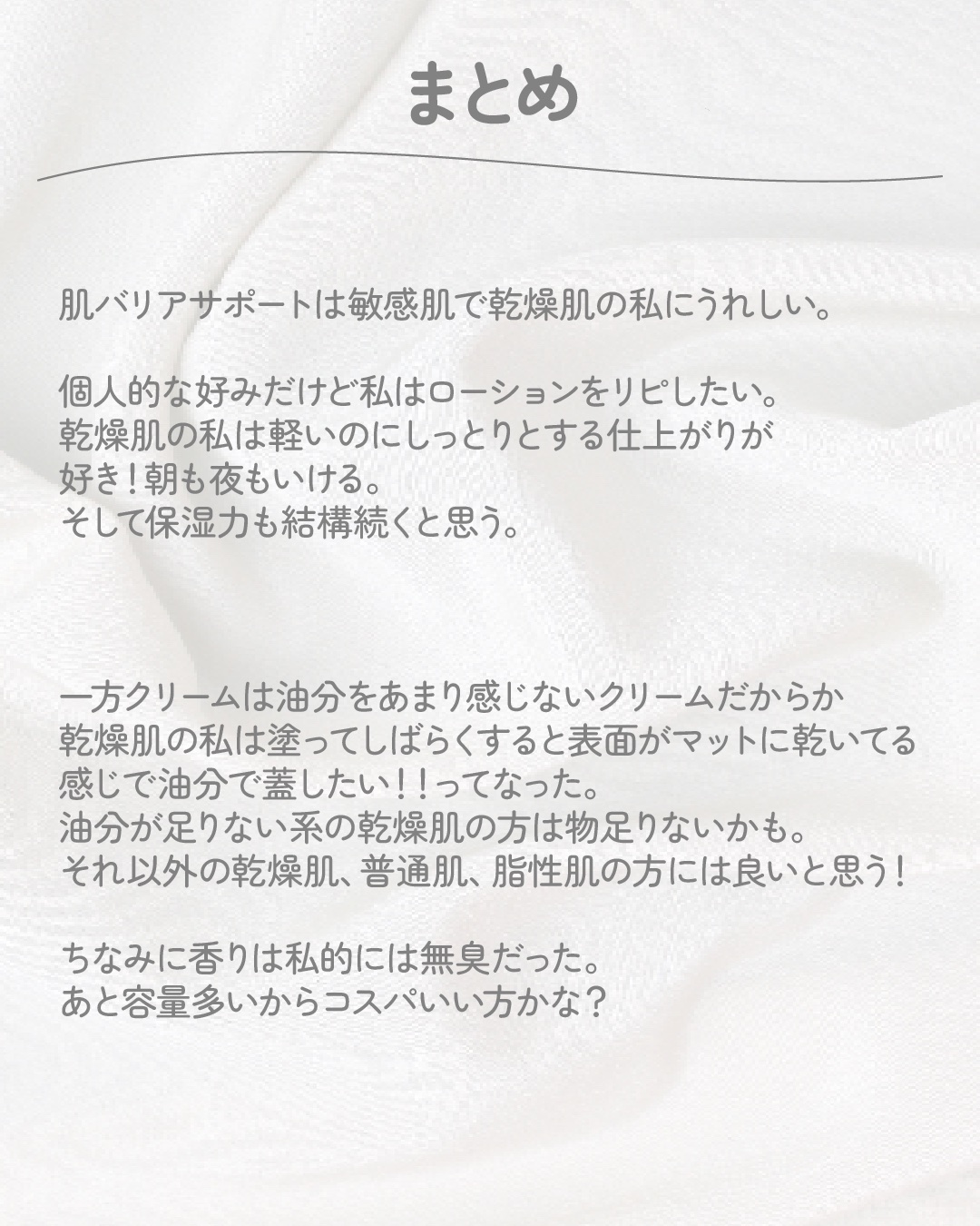 無香料なんだろうけど湿った埃だらけの部屋みたいな匂いがして毎回不快な思いをしながら使用🥲 伸びは良くて油分感少なめ アトピーで乾燥してるところに使用してましたが調子は悪くなかった