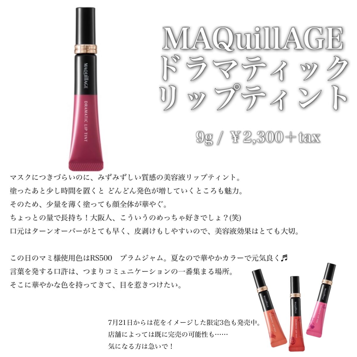 マキアージュドラマティックリップティントRS500プラムジャムこちらは10/21に新発売されるマキアージュのドラマティックリップティント!〝マスクにつきにくい×みずみずしい発色が続く〟そんな今の時代に嬉しいテーマで開発されたこのリップティント...