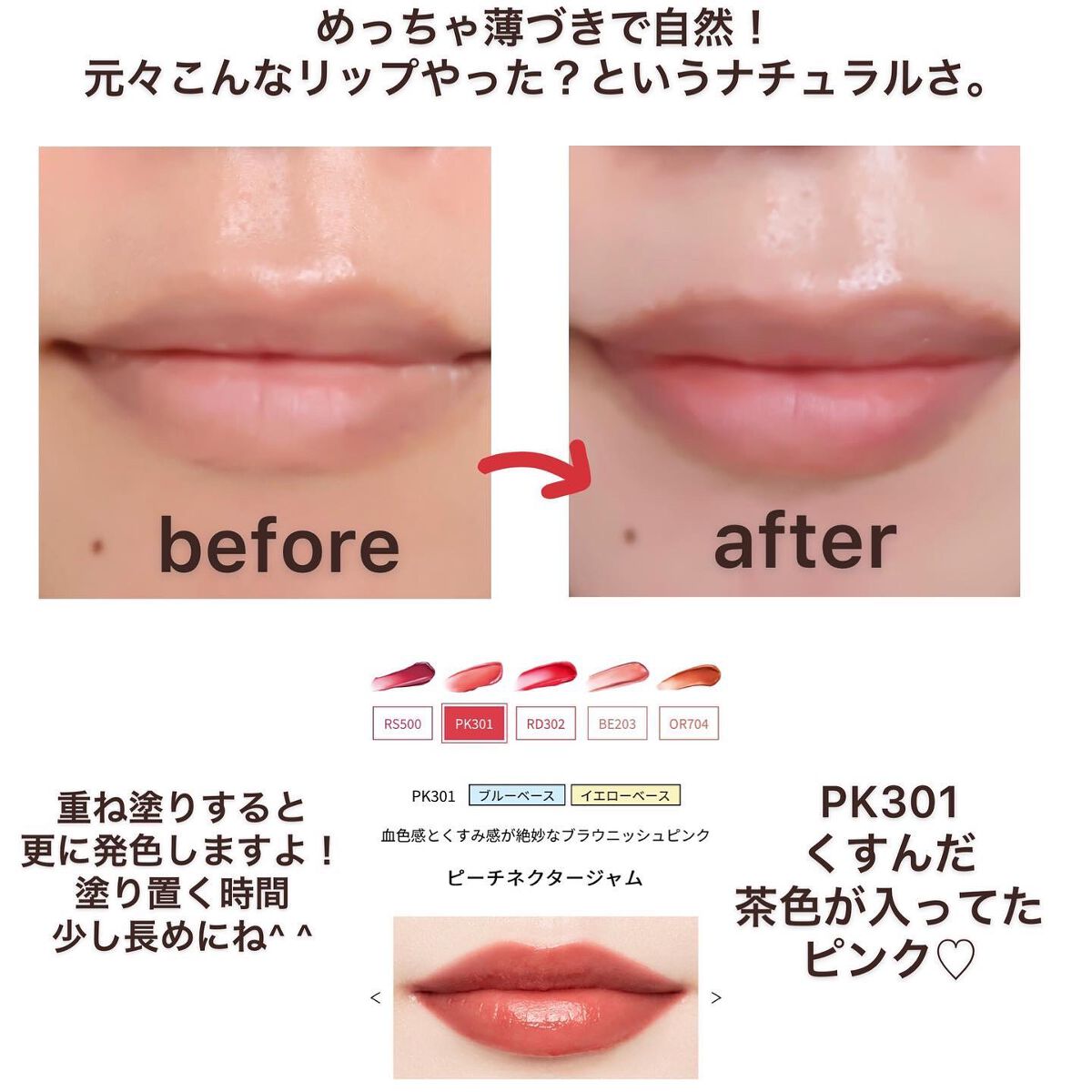 唇がちゅるんとする感じ 潤っている感じが続いているなと感じました ほんほり抜け感や透け感がある感じ PK301はほんのり赤みがあって 浮いたりしない ヘルシーな印象でした パケがおしゃれなので いつもメイクポーチにいれておきたい