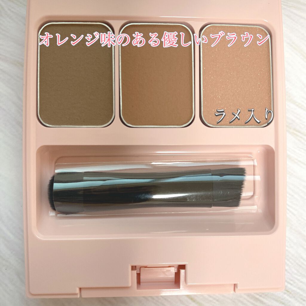 絶妙な甘さが出る、黄みとピンクみを感じるブラウンパレット。 それぞれニュアンスの違う血色感(メークアップ効果による)が楽しめます。 左のカラーはアイブロウにしては珍しいシマーカラーで、透明感と抜け感がでます! 右のカラーを眉尻に、真ん中のカラーを使って眉頭から眉尻に向かってぼかしていき、左のカラーを全体に上からのせてみました! 普段使いしやすいカラーですが、絶妙な抜け感があって一気に垢抜け♡ パウダーはふわふわしつつもしっとりめで、ムラなく乗ってくれます。 付属のブラシも毛は固めだけど、チクチクせず使いやすいです!
