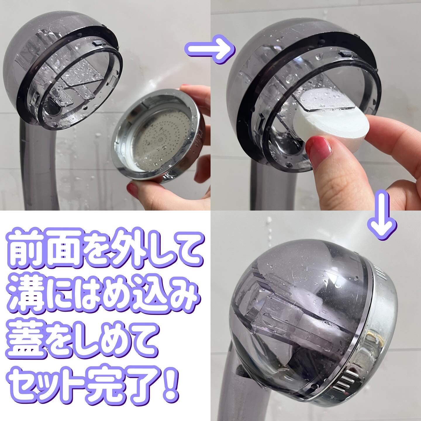 無香料、無着色、塩素中和と ケミカルストレスフリーなので お肌が弱い人でも利用しやすいです✨ ビタミンCが 配合されているので 水道水の残留塩素を中和し、 なめらかな肌触りのお湯になるそう! シャワーヘッドは透明感ある デザインで、 装着したタブレットがぶくぶく しているのが見えて楽しいです!