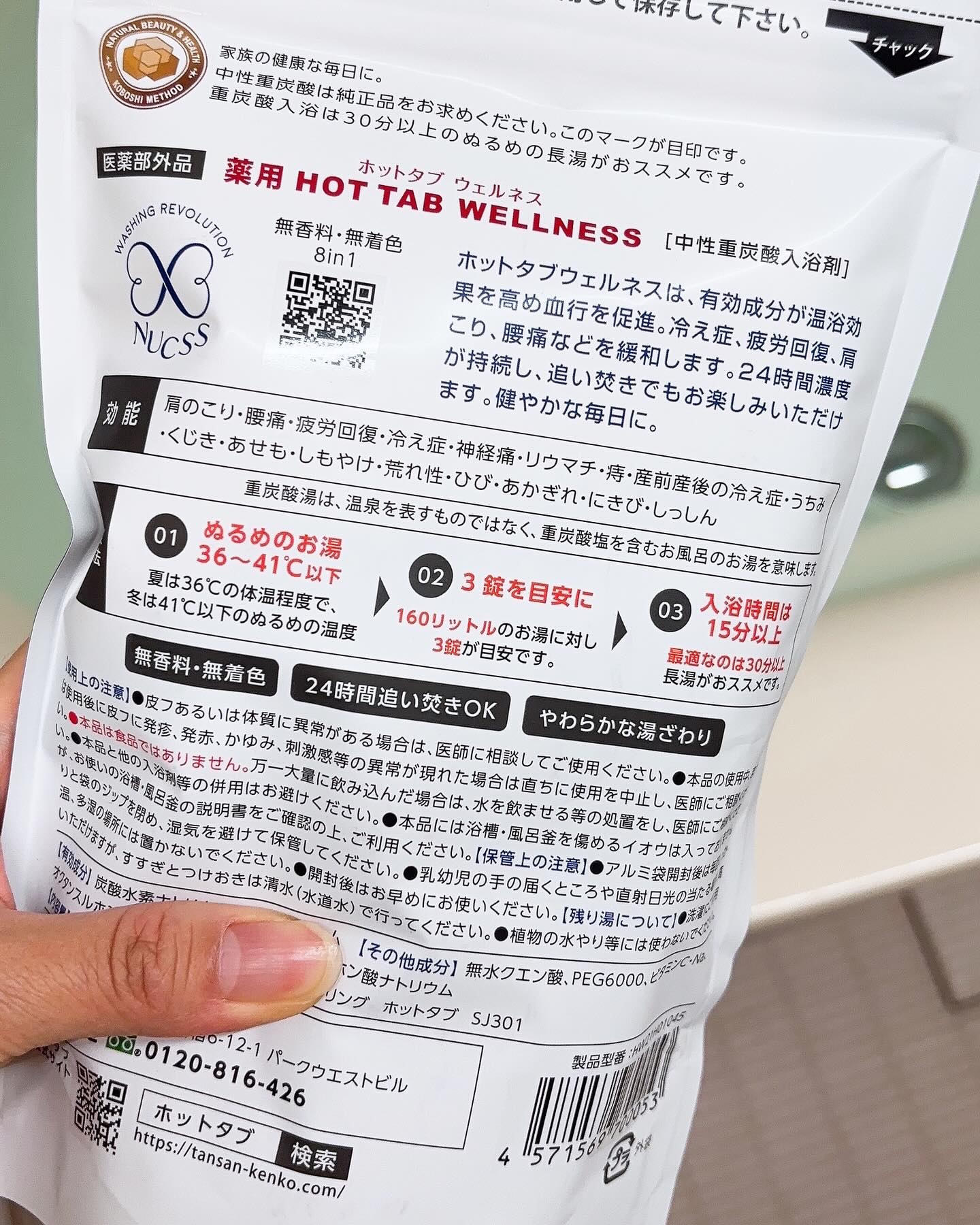 HOT TABさんの薬用 HOT TAB WELLNESS 45錠入りこちらの💁♀️中性重炭酸入浴剤のご紹介です🤗✨ [重炭酸入浴法]ぬるめのお湯160リットルに3錠を溶かして15分以上入浴すると🙆♀️ 私は塩素が苦手な体質で塩素対策できる入浴剤を探していたところ少し前にHOT TABさんのオンラインセミナーを受けてお試しさせて頂いたあと使い心地が気に入ったので購入し使用致しております🥰 お湯色は透明で香料も入っておらずお湯の質を変えてくれる様な入浴剤なのでクセなく使えて🙆♀️💖 髪の毛を束ねるようなネットと組み合わせてシャワー🚿にHOT TABを付けて使用すれば重炭酸シャワー🚿を浴びる事ができるという事をオンラインセミナー時にお聞きしたので特に夏の時期は塩素の量が多くなるらしいのでかな〜り頼りにしちゃってます🥰