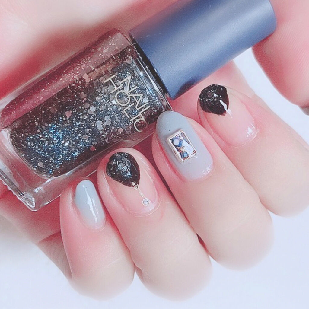 ネイルホリック ネイルホリック フューチャーメタル BE340 こちらはベージュの中に 青ラメが輝くの💙✨ すごい好き! リミテッドカラー COSMIC JOURNEY BK084 ブラックのラメは最高じゃ😎 個人的には ブラックラメの存在感を 残したくて、、ちょんと●まるを 崩した感じで置いてみたり、、 COSMIC JOURNEYのハケは 短いから、色々やりやすい!