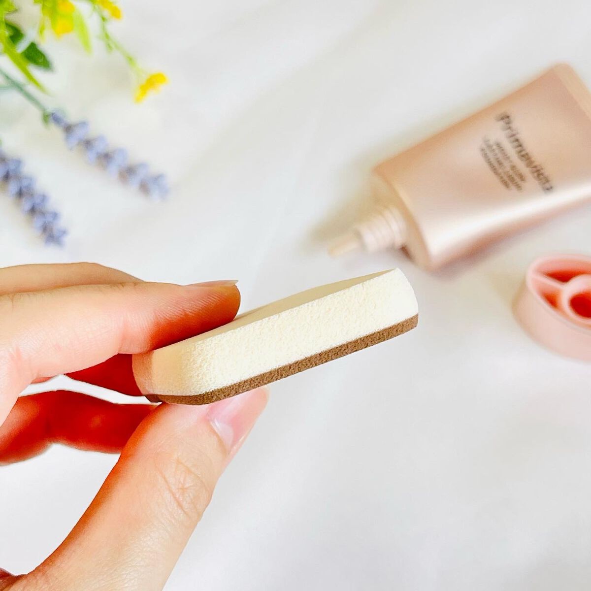 まず、パッケージと容器はシンプルでありながらプリマヴィスタさんらしさを感じられるオシャレなデザイン。 こちらは付属の専用2面スポンジを使ってつけていきます。 出してみると、ぷるんとしていてとろみのあるテクスチャー。 このスポンジがとっても使いやすく、つけた後はベタつかずしっとりとした使い心地でツヤっとした質感(メイクアップ効果による)。 密着感・つけ心地・ツヤ感(メイクアップ効果による)がとても良かったので、使い続けていきたいなと思います✨