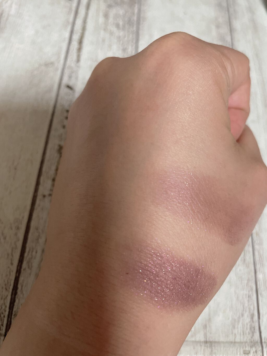 クリームタイプなのですが、そこまで柔らかい感じでもなくなめらかですするすると塗ることができます。 色味は本当に可愛い〜!!!!!!! 黒が隠し味となっているみたいなので、少しダーク感があってとっても好みのカラーです✨ そしてラメもぎっしり。いろんなカラーのラメが入っていて、ツヤ感、ラメ感共に最高すぎる…! 指でスッと塗るだけでまぶたに色気が…♡ 重ねるごとに発色が強くなるので調整も簡単。 目尻だけ濃くしたり、メリハリをつけても可愛いです。 クリームシャドウは二重の幅に溜まりやすいイメージでしたが、こちらは結構サラッとしているのでそのようなこともなく、使いやすいとっても綺麗なアイシャドウです♡