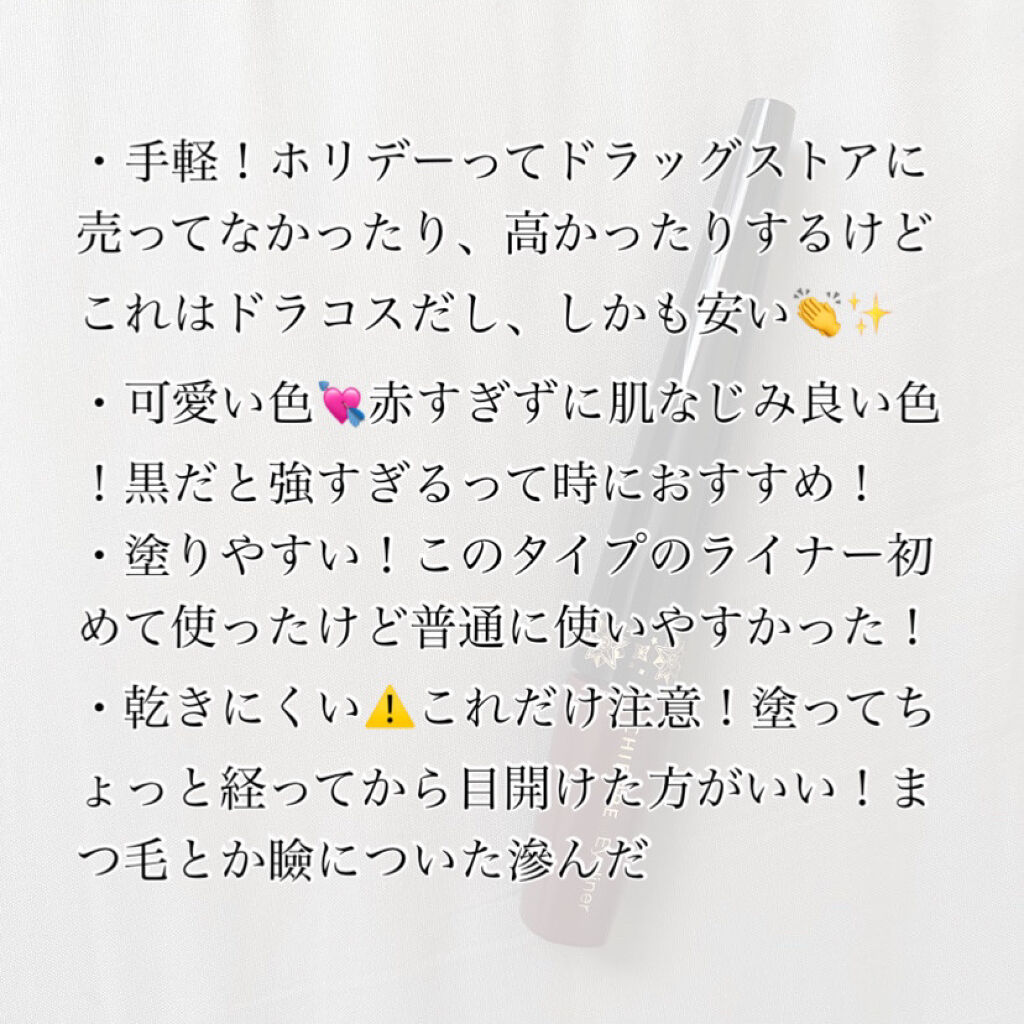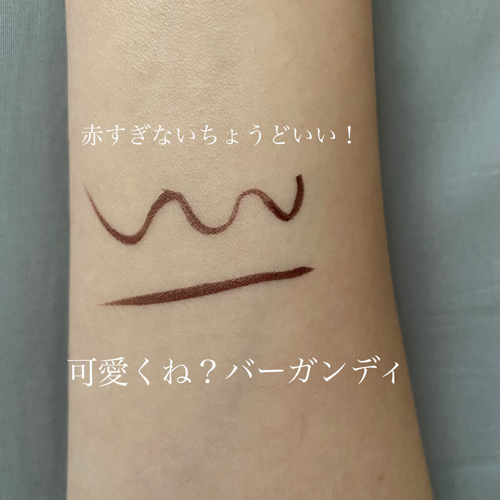 バーガンディとか可愛すぎる🤦♀️💗 太い線も細い線も描きやすい✨ 容器のふちでしっかりと液を減らさないと沢山つきすぎちゃうのでそこだけ注意⚠️ あとは、力を入れすぎないようにスっと引けば綺麗なラインが描けますᐠ ❤︎ ᐟ ドラッグストアでも購入できるし、LIPPS shoppingでも購入できるのでポイント余ってるからにもおすすめ!!