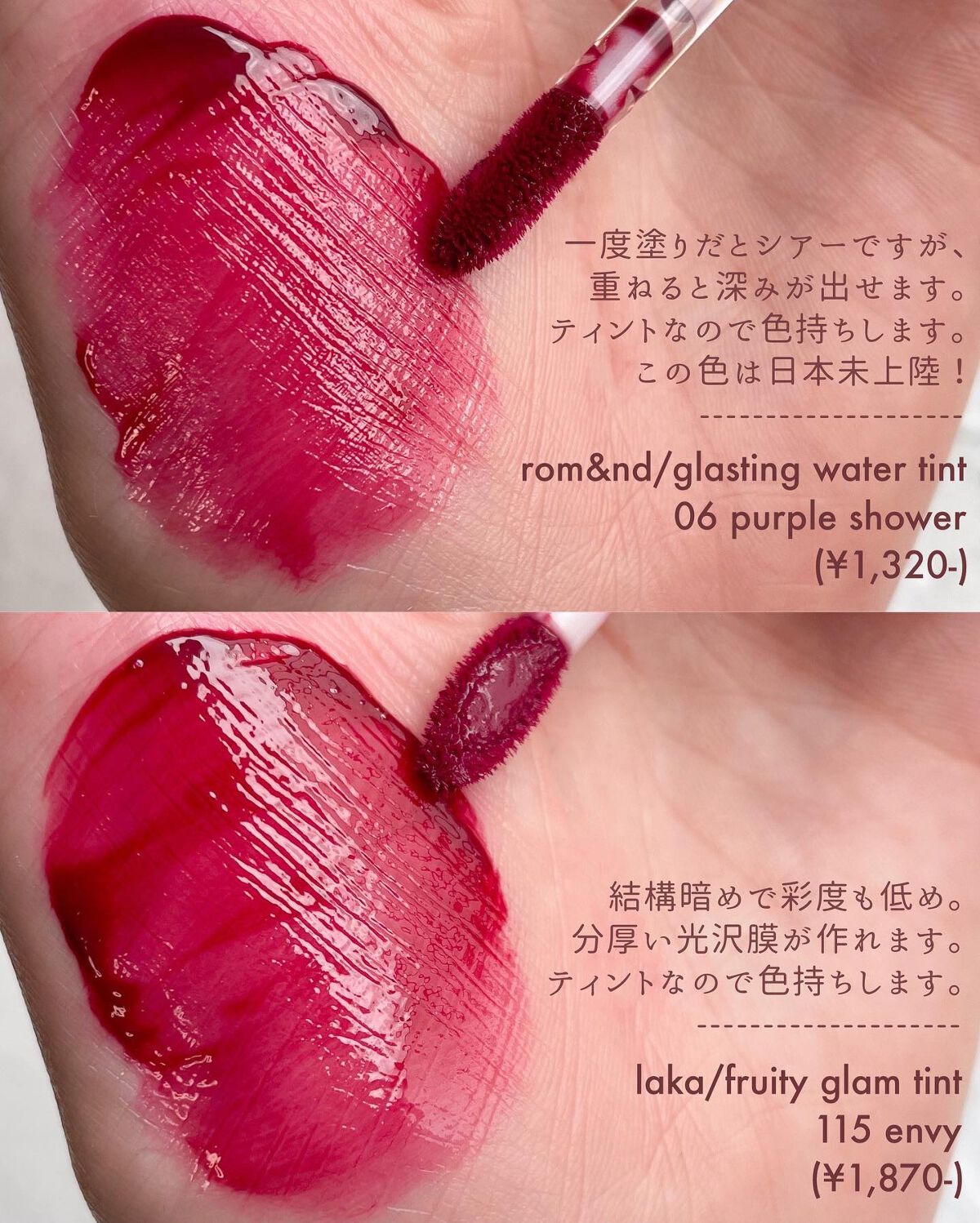 クレドポーボーテ ルージュアレーブル 23 パッションフラワー (¥6600) シュウウエムラ ルージュアンリミテッドキヌサテン WN288 (¥4070) eglips ブラーパウダーティント 05 Deep Rosebay (1+1 ¥1699) rom&nd ジューシーラスティングティント 17 PLUM COKE (¥1150) MERZY バイトザビート メロウティント M4 Bian Rose (¥1200)