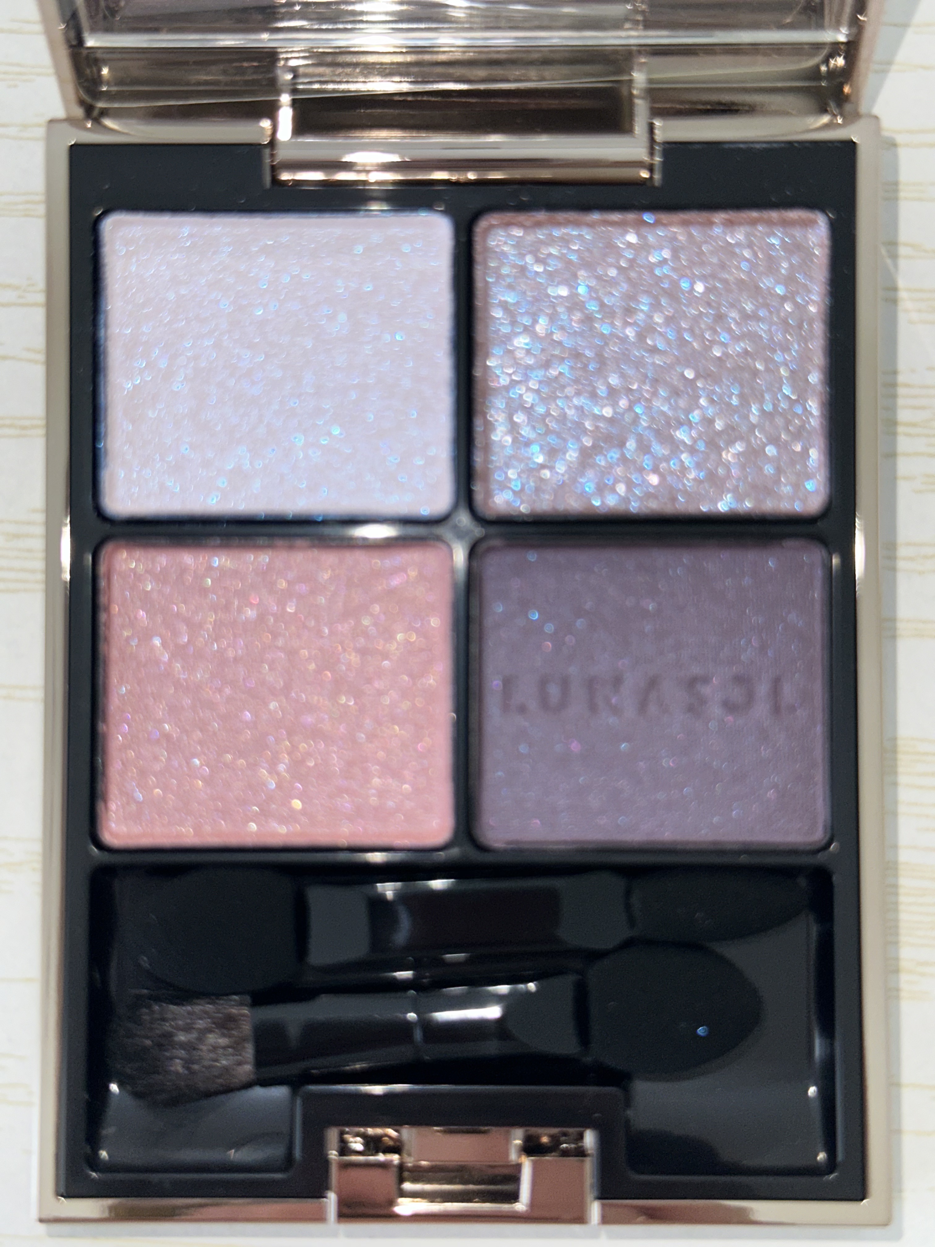 パレットを開けて直ぐにときめくカラーとラメ感。 ブルベだったらたまらない組み合わせの4色。 私も思わずうっとり眺めてしまうほど凄く好きなカラーのアイシャドウです。 ただの青みカラーじゃなくてくすみが入っているのも私に凄く刺さっている要因かも。 元々ホリデーのアイシャドウということもあって普段のパレットよりラメ感が強いので私は普段よりアイシャドウの量を調整しながら使っています笑 左上 偏光ブルーパールが入った肌馴染みの良いベージュカラー。 左下 ゴールドやピンクの細かいラメが入ったサーモンピンク気味のブラウン。 右上 シルバーと青ラメがザクザク入ったブラウンベージュ 右下 ほぼマットながらもほんの少し細かい青や紫ラメが入ったパープルを感じるブラウン。