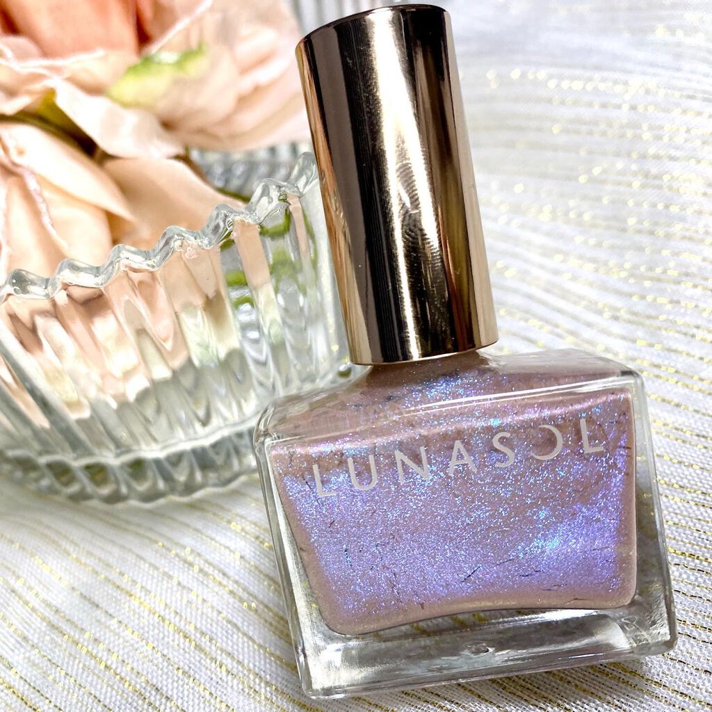 ひと塗りで、見たままの鮮やかな発色を叶えるネイルポリッシュ。 ムラなく均一な塗り心地で、速乾性に優れ、ツヤが弧を描くような美しい仕上がりに。 モーヴピンクのベースカラーに、ピンクからバイオレット、ブルーへと偏光するラメがたっぷりと含まれています🤍✨ とにかくこの偏光ラメが美しすぎる😭 ぎっしりと詰まった青ラメがピンク〜バイオレットに偏光する様はまさにオーロラのよう! ベースは肌馴染みの良いベージュに近いモーヴピンクで、1度塗りだとそこまで発色せずに透明感のある仕上がりに✨ ルナソルのネイル自体初めて使ったのですが、塗りやすいこと塗りやすいこと! 乾きも早くて、待つストレスもゼロ💯 これは絶対実物を見てほしいアイテム🤍 見た瞬間、気づいたら購入してますよ!