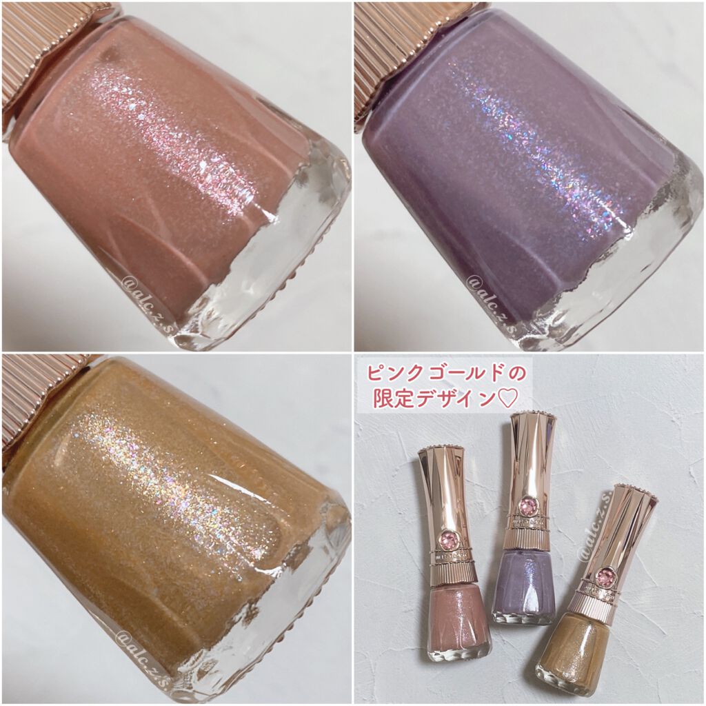 - リニューアル発売 ジュエリーのような美しさにときめくネイルカラー。ネイルラッカーは、クリスタルのスワロフスキー(R)をあしらった、濃密な色合いを叶えるノンパールの高発色カラーです。速乾性に優れたクイックドライタイプ。さらにネイルプロテクト成分を配合し、つけたての美しい発色を保ちます。女性らしいフォルムにヴィンテージジュエリーのようなお花のモチーフを施し、ギフトにもふさわしい洗練されたデザインです。これまでよりもキャップが長くなり、より使いやすくなりました。
