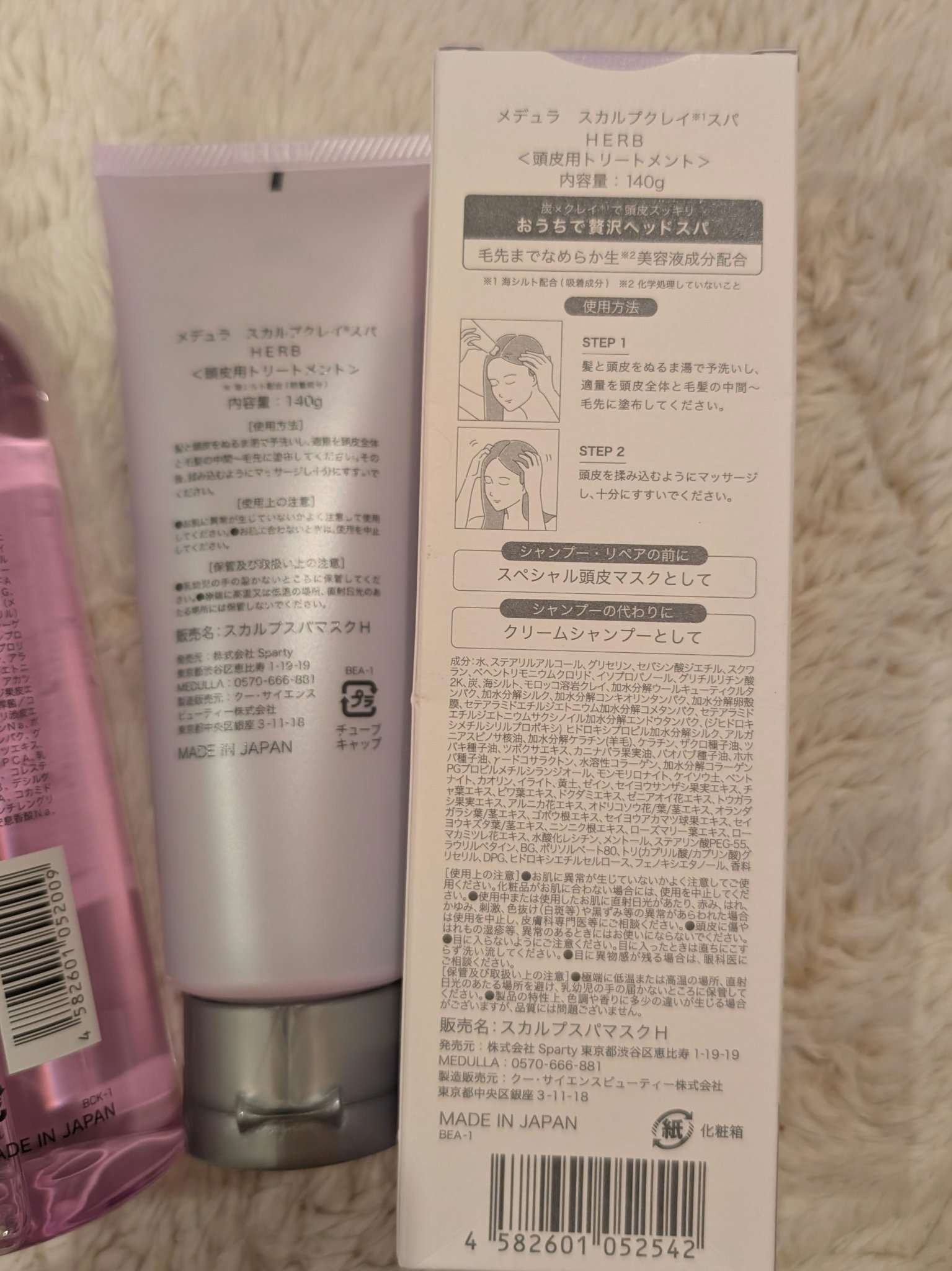 メデュラのSHAMPOO&REPAIR、今回はHERBを頼んでみました💜個人的にそんなに香り好きじゃなかったです🥹が、慣れてきたらだんだん大丈夫になってきました🤭でも、推しカラーで推しの名前入りにしたので、そこはかなり満足☺️パッケージデザインも季節で変わるのか、チェック柄になってました💜今回は前回頼んだものと少し変えて、痒みが出ないようにとかに特化してもらいました🙏そして使ったら、前回より洗う時は重さを感じて液体もトロンとして重かったのに、乾かしたらめっちゃサラサラでした😳よくいえばサラサラだけど、悪くいうとまとまりない感じ😅全体的に前回頼んだ配合の方が私には良かったのかも?🤔スカルプマスクのチューブタイプというのも今回初めて頼んでみて、使い方は⬇にサイトから引用しました💓✲゚**✲**✲゚**✲**✲゚*✲゚**✲**✲゚**✲**✲゚【スカルプマスク チューブタイプ】内容量:160g 1回の使用量:約5円玉大(直径22mm)を8箇所に 使用頻度:毎日STEP1頭皮と髪の汚れをお湯で洗い流した後、シャンプーの前にお使いください。STEP2マスクが頭皮にまんべんなく行き渡るよう、チューブの先を直接頭皮にあてながら、数点にわけて塗布、または適量を小分けに手にとって、頭皮に馴染ませてください。1回の使用量の目安:約5円玉大を8箇所に塗布※チューブの先端部分が5円玉大になっております。STEP3頭皮全体にマスクをなじませたら、指の腹を使ってやさしくもみほぐすように、30秒程度マッサージします。STEP4お湯で十分に洗い流したら、シャンプーで頭皮と毛髪を洗います。*✲゚**✲**✲゚**✲**✲゚*✲゚**✲**✲゚**✲**✲゚スカルプマスクのチューブタイプの感想は少しスッキリって感じで痒みとかも出なかったし、たまにリフレッシュで使うならアリだなと思いました🙆🏻5円玉大を8箇所に塗布が出来てるのか分からなくて、説明通りにマッサージも出来てるのか?って思いつつ使いました😅私は最初頭皮に直にチューブあてて使ってましたが、1度手に出してからの方が使いやすいかもしれませんでした😃これ使うと髪が硬さ出てしっかりした気がします🤔クリームシャンプーとして使えるらしいですが、私はまだスペシャル頭皮マスクとしか使ってなくて、今後もその使い方が多くはなるなと思ってます😌(商品追加で出てきませんでした)ヘッドスクラブのサンプルはまだ使ってないので、使ったらレビューするかもしれません🙋#UVダメージメンテ術