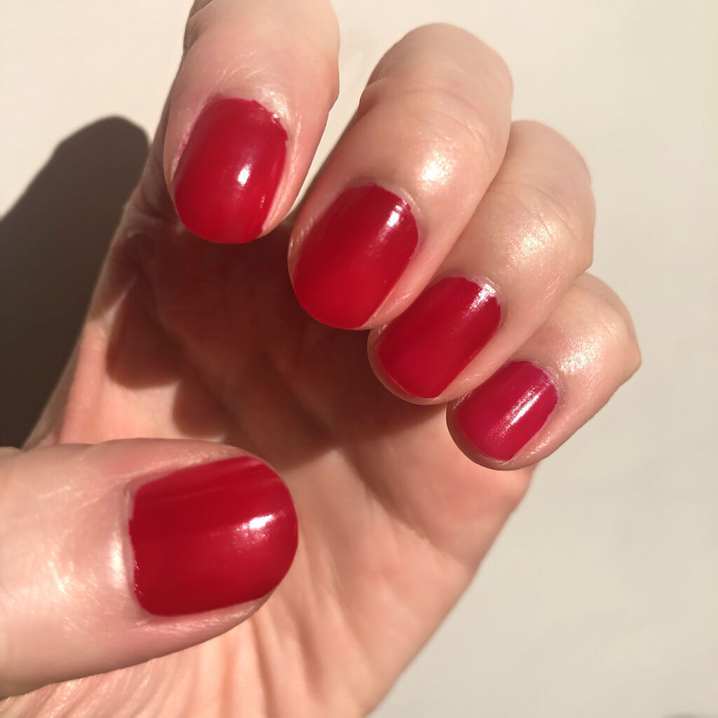 真っ赤というよりは朱色です。イメージしていた色みではなかったので正直手の爪に塗ると違和感なのでフットネイル用にしています。刷毛は変わらず塗りやすいし、不器用なセルフネイル初心者でも扱いやすくて助かります。ただ、このボトルのタイプだと持ち手が小...