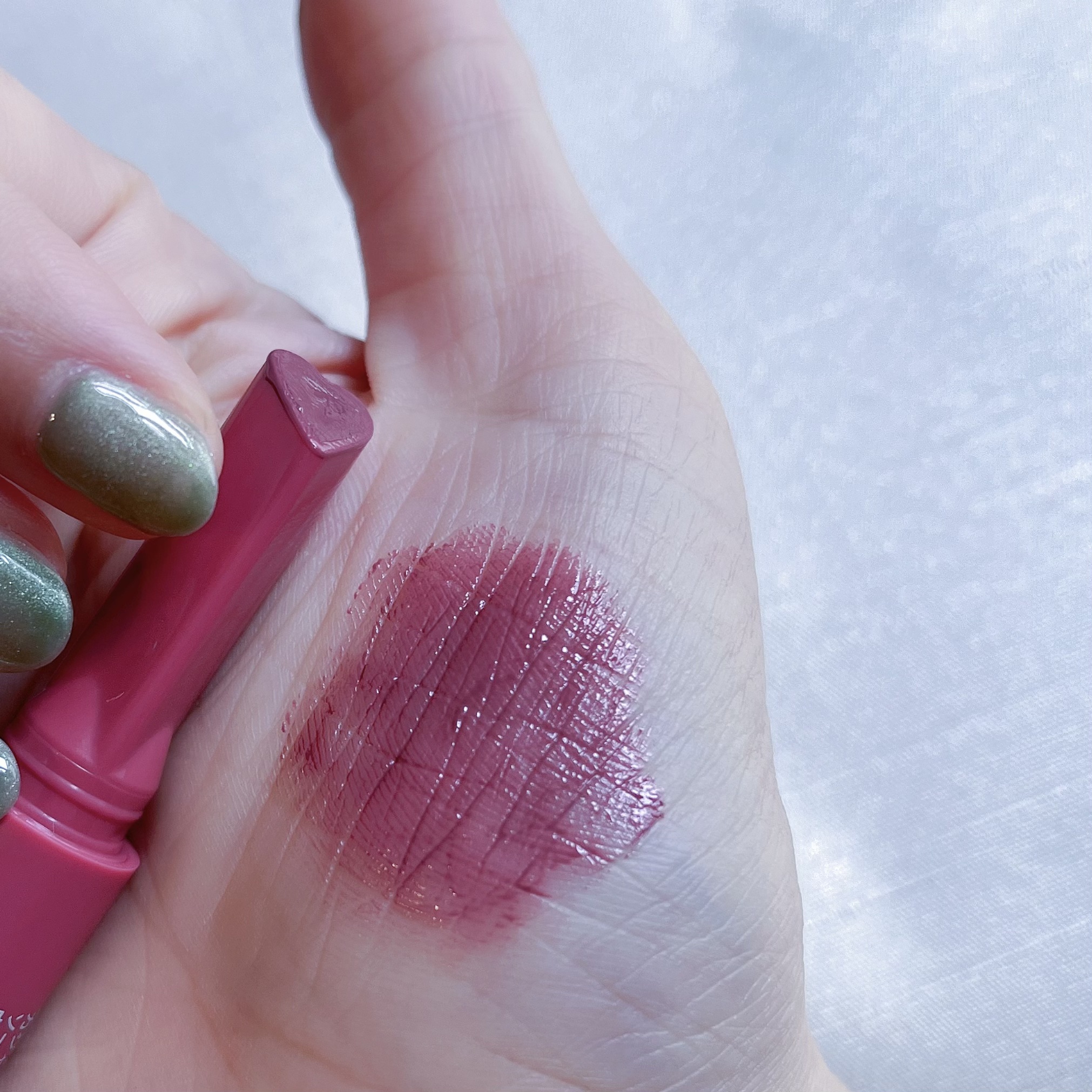 最初腕に塗った時は思っていたより色が濃くて紫強めだったのでびっくりしたけど唇に塗ったら意外と馴染んでかわいかったです。 柔らかいバームのリップで色持ちはそんなに良くないです。 しっとりしていて保湿されるけどツヤ感は強すぎないので個人的には使いやすくて良かったです。