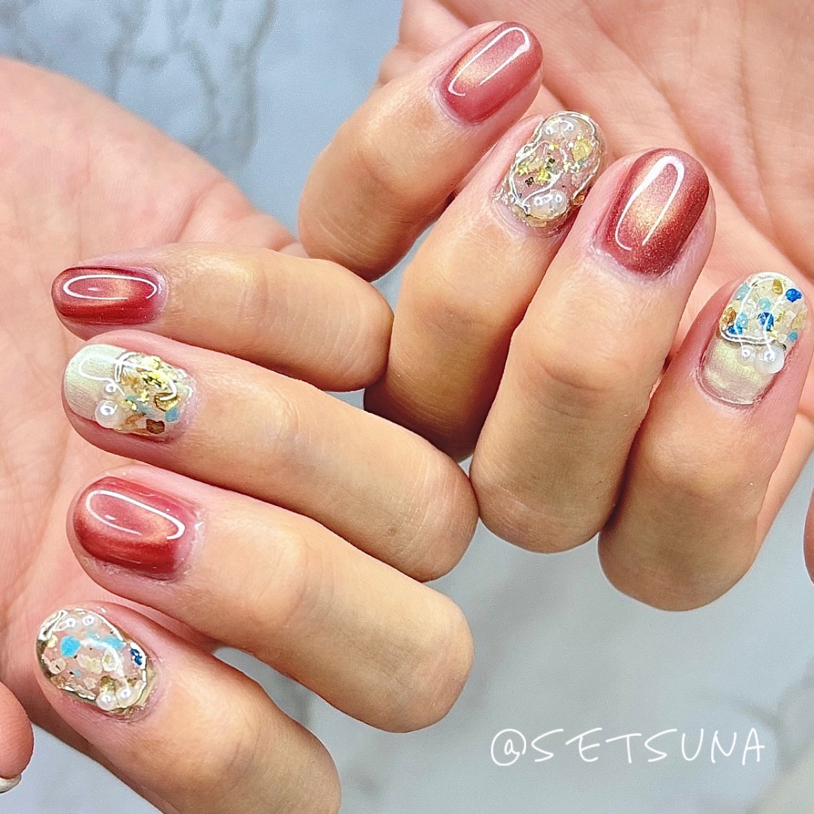 夏先取りフレークネイル☀️________________________▼詳細....●ベース&トップジェルネイル工房/ペロリンEASYグレースジェル/スカルプチュアKOKOIST/ウルトラグロッシーノンワイプトップコートジェル●カラージェルプチプラ/カラージェル オパールbeach/Re:gelRiseシリーズMG756●その他SHEIN/フレーク 〈36176426〉SHEIN/半球パール 〈32658347〉SHEIN/マットコート 〈19297200〉ネイルタウン/アイシングジェルネイルタウン/ニュアンスクロムパウダータイプB________________________________水色のフレーク使って夏っぽいネイル☀️パール入りのカラージェル使って涼しげもプラス。リジェルのMG756は一度塗りで高発色✨くすんだ赤とゴールドのマグネット粒子が落ち着いてるけどちゅるん感あって最高♡♡デザイン的にはお気に入りなんだけど今回はベースのフォルムがボコったのが悔しい!!もっと緩めのベースの方がいいのかな、、でも爪弱いから厚みも欲しいんだよな、、ベース探しの旅が始まりそうです✈️#セルフネイル#セルフジェルネイル#夏ネイル