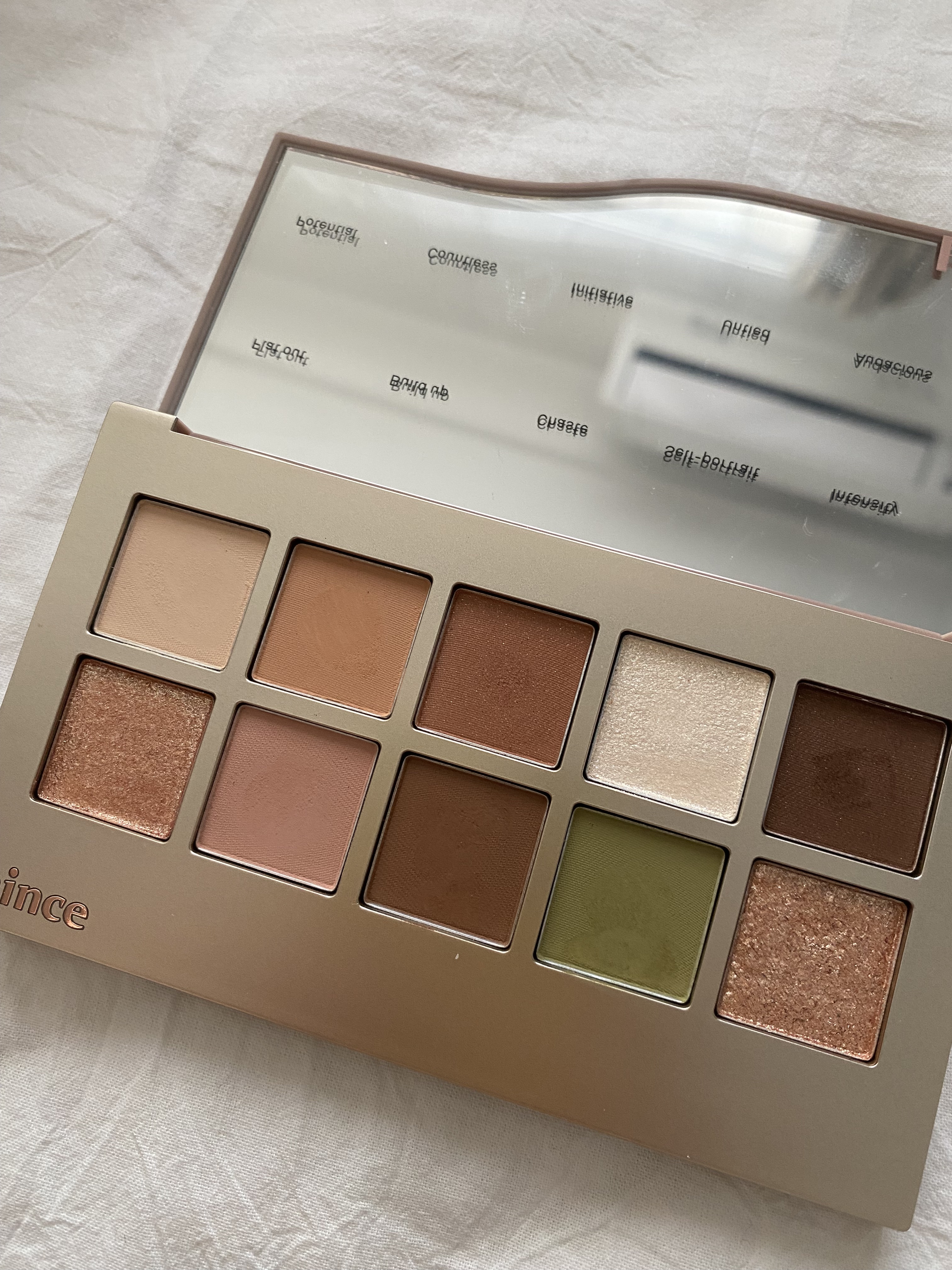 グリーン&ベージュ系パレット グリーンの中ではかなり初心者にも使いやすかったです𓅯𓂂𓏸 質感もふんわりマットでボカシやすいので さりげなくいれやすいです そのほかの9色はホワイトから ベージュ・ブラウンなどの使いやすい 優しいカラーが詰まっていて、マット・グリッター・バーム、 シマーグリッターなど 質感も少しずつ異なります 𓍯 hinceは可愛くてオシャレなコスメが 多いけど、わたしはその中でも ニューデップスアイシャドウパレットは 1番好きな商品です🧸🤎